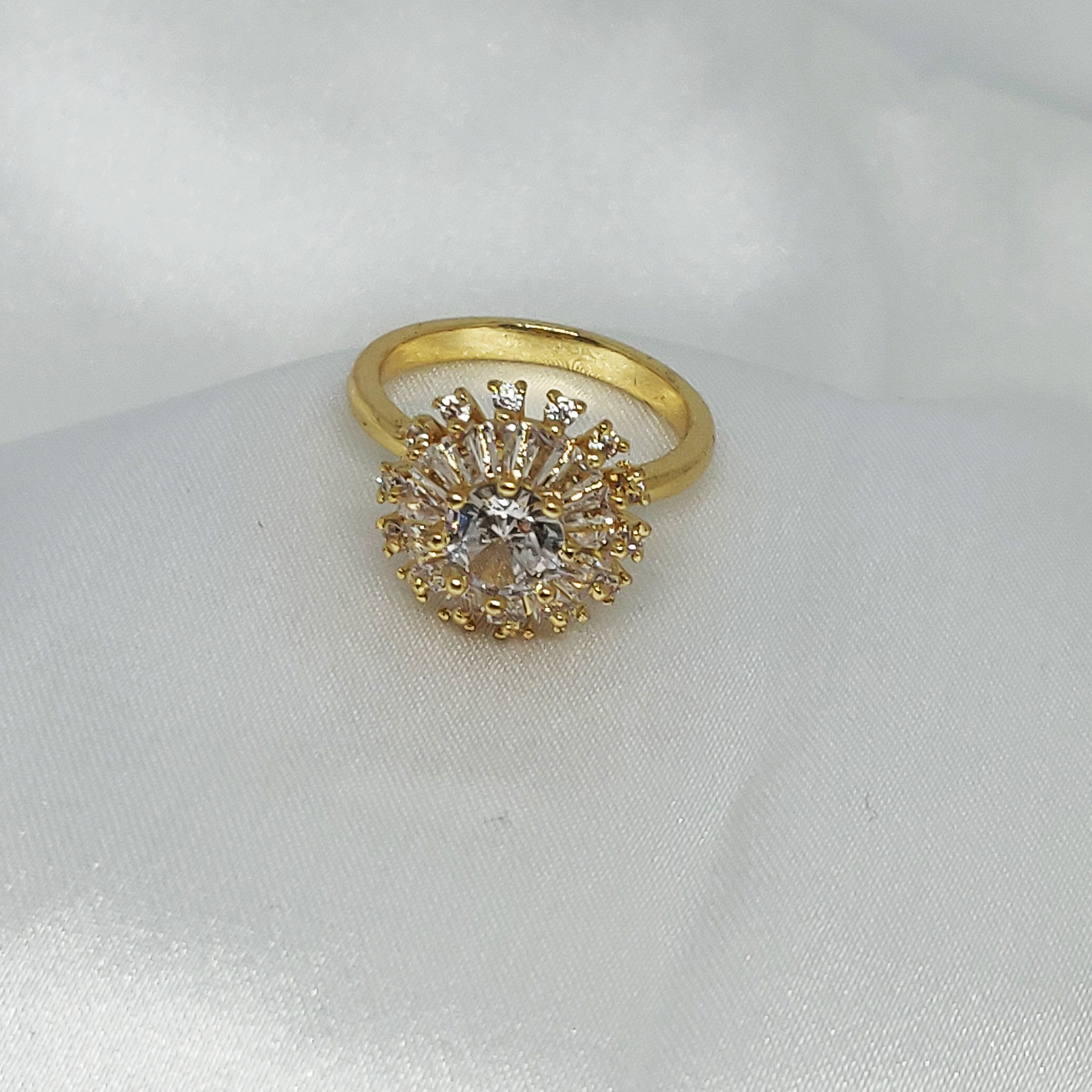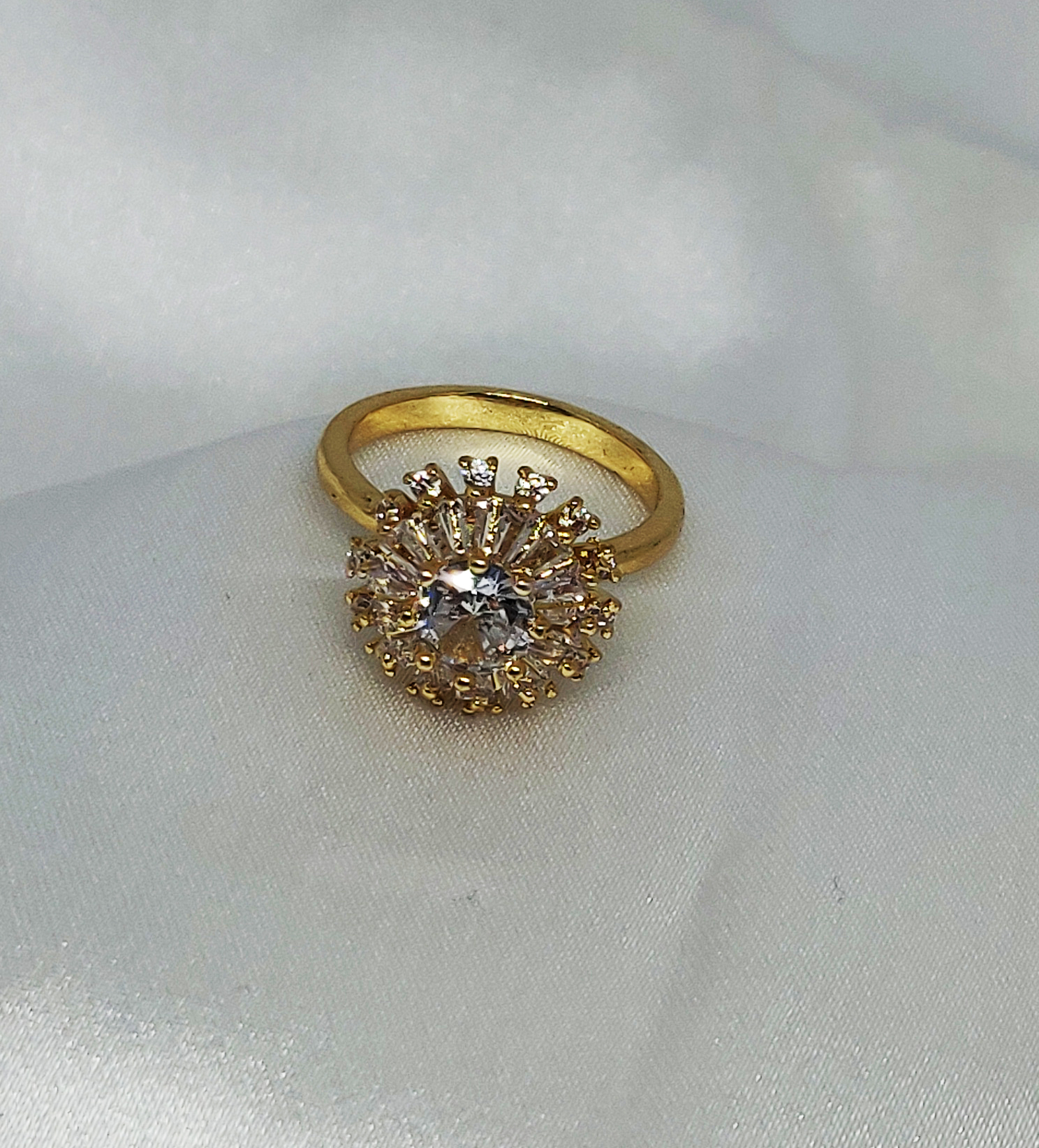 This exquisite finger ring brings regal charm to your look with its radiant silver centerpiece. Designed in a floral sunburst pattern, the central silver stone is surrounded by sparkling baguette and round-cut crystals, creating a magnificent play of light. Set on a rich gold-tone band, the ring offers a perfect blend of elegance and glamour—making it a standout accessory for any celebration.