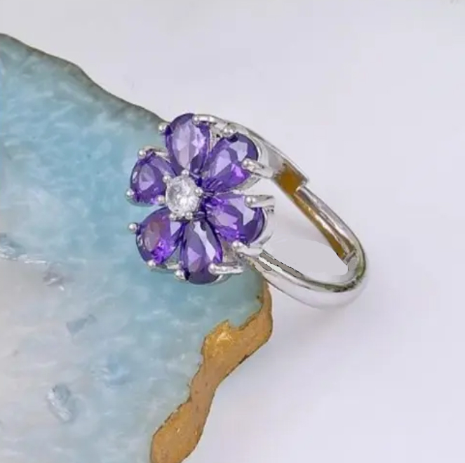 Elegance meets enchantment in this radiant floral finger ring, featuring deep violet teardrop-shaped stones arranged into a delicate flower design. Nestled on a polished silver-tone adjustable band, the petals are accented by tiny shimmering crystals that add a refined sparkle. This ring captures a luxurious yet graceful aesthetic, making it an ideal statement piece for both day and evening wear.