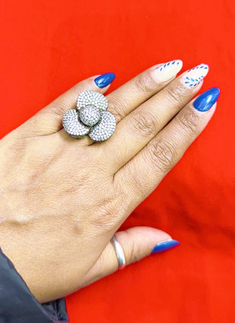 This stunning finger ring is a showstopper, featuring a glamorous floral design encrusted with shimmering white crystals. Each petal is meticulously paved with stones, creating a rich, luxurious texture that reflects light from every angle. The raised center adds dimension and depth, giving the ring a sculptural elegance. Crafted for statement appeal, this adjustable ring brings together the grace of floral motifs with high-octane sparkle — perfect for both festive and formal occasions.