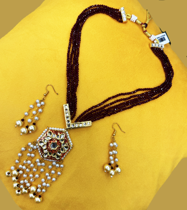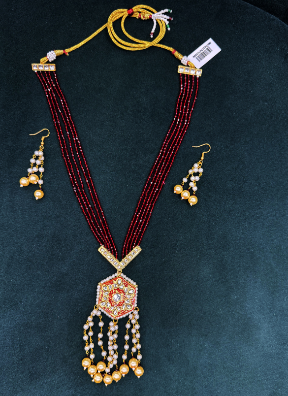 This striking necklace set features deep maroon beaded strands paired with a hexagonal pendant that showcases intricate kundan work and vibrant floral motifs. The pendant is further embellished with pearl and gold drops, adding an elegant touch. The set comes with matching drop earrings, designed with pearls and gold accents, creating a perfect balance of tradition and modern charm. Ideal for weddings, festive occasions, or traditional events, this set exudes a sense of regal beauty.