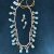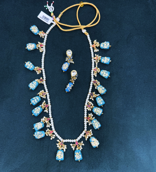 This necklace features a vibrant design with turquoise blue teardrop pendants and delicate white pearl beads, interspersed with small golden and ruby red accents that add a touch of regal elegance. The central section of the necklace displays intricate floral motifs, combining the same turquoise, gold, and ruby elements. It comes with matching earrings that mimic the design and color scheme of the necklace, providing a harmonious and complete look. Ideal for festive occasions or traditional wear, this set radiates a classic yet contemporary charm.