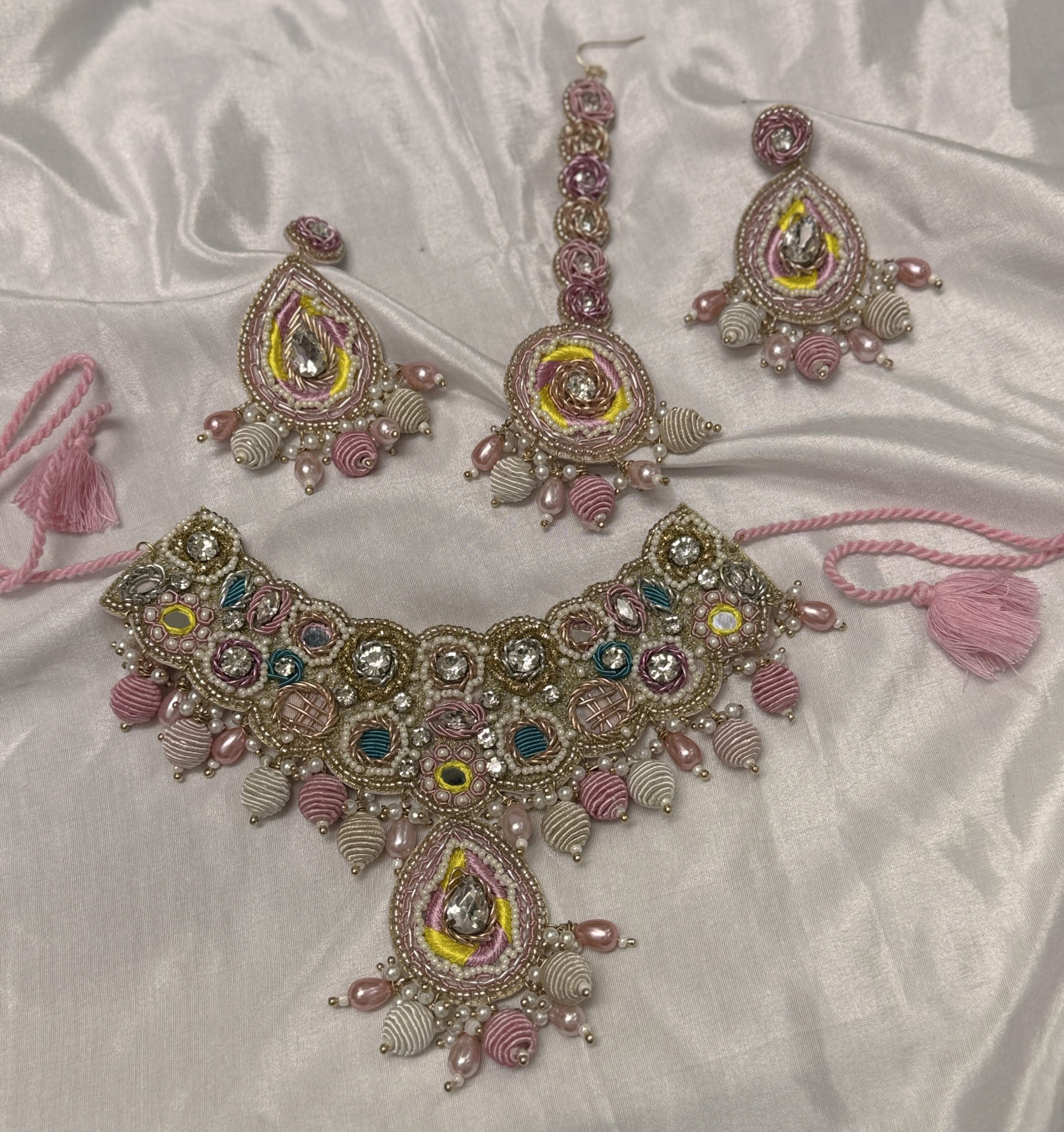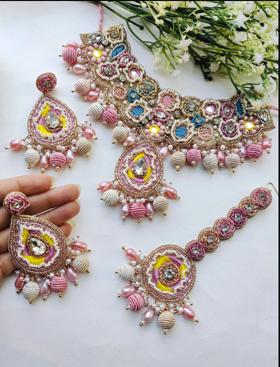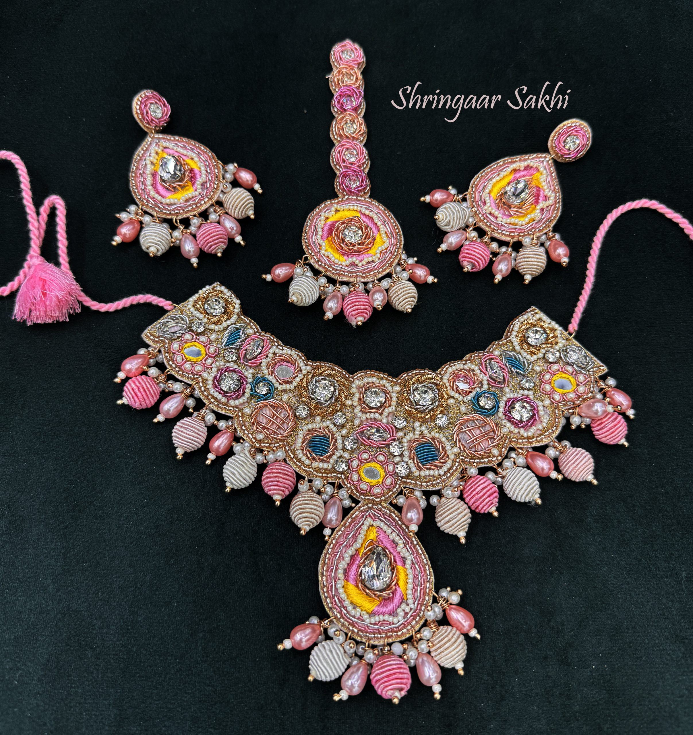 This jewellery set features a unique handcrafted design with vibrant embroidery and beadwork in shades of pink, yellow, and gold. The set includes a statement necklace, matching earrings, and a maang tikka, all embellished with intricate threadwork and beaded accents.