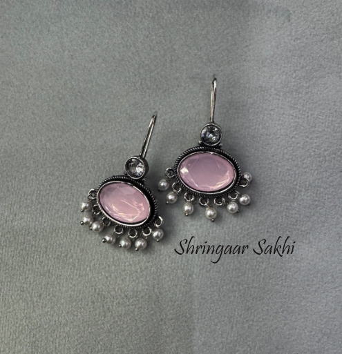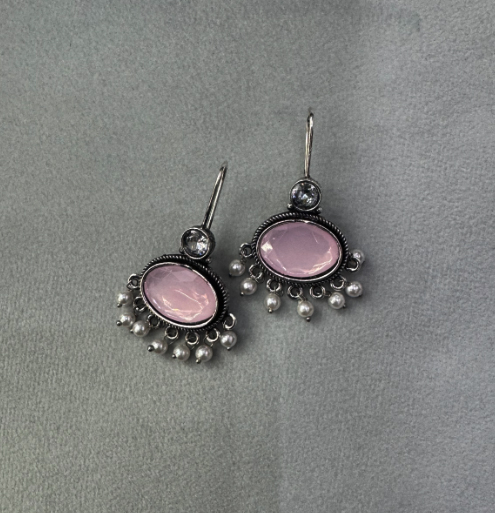 These dainty earrings showcase a soft pink stone as the centerpiece, surrounded by delicate silver beads that dangle elegantly, adding a touch of charm. The top features a small, clear stone that balances the design, making the earrings versatile for both casual and semi-formal settings.