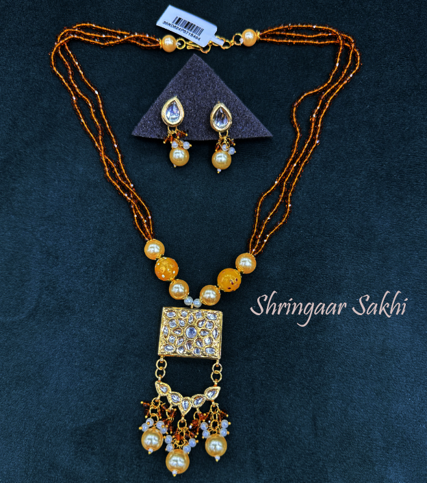 This vibrant necklace set showcases a blend of bold orange beads paired with delicate pearls, leading to a rectangular gold pendant adorned with sparkling kundan stones. The pendant also features pearl and bead drops, adding a playful yet elegant touch. The set is complemented by matching earrings, designed with teardrop-shaped kundan stones and pearl accents, making it a perfect choice for festive celebrations or traditional occasions.