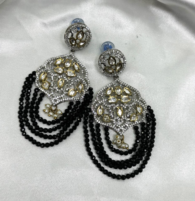These earrings feature a stunning combination of intricate silver-toned filigree work, highlighted by brilliant white stones in a traditional pattern. The cascading layers of black beads add a bold and contemporary flair, providing a striking contrast to the delicate, shimmering stones. The design is further enhanced by tiny pearl accents that give a refined finish, perfect for making a statement at any festive or formal occasion.