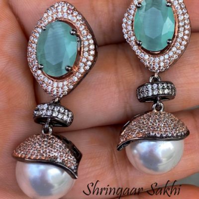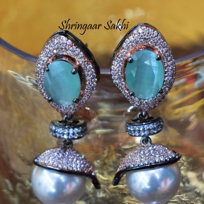 A medium-sized earring features a striking black crystal stone at its center, exuding elegance and sophistication. Intricately adorned with AD stone work, it adds just the right amount of shimmer and sparkle, making it a versatile accessory that effortlessly elevates your look for any occasion.