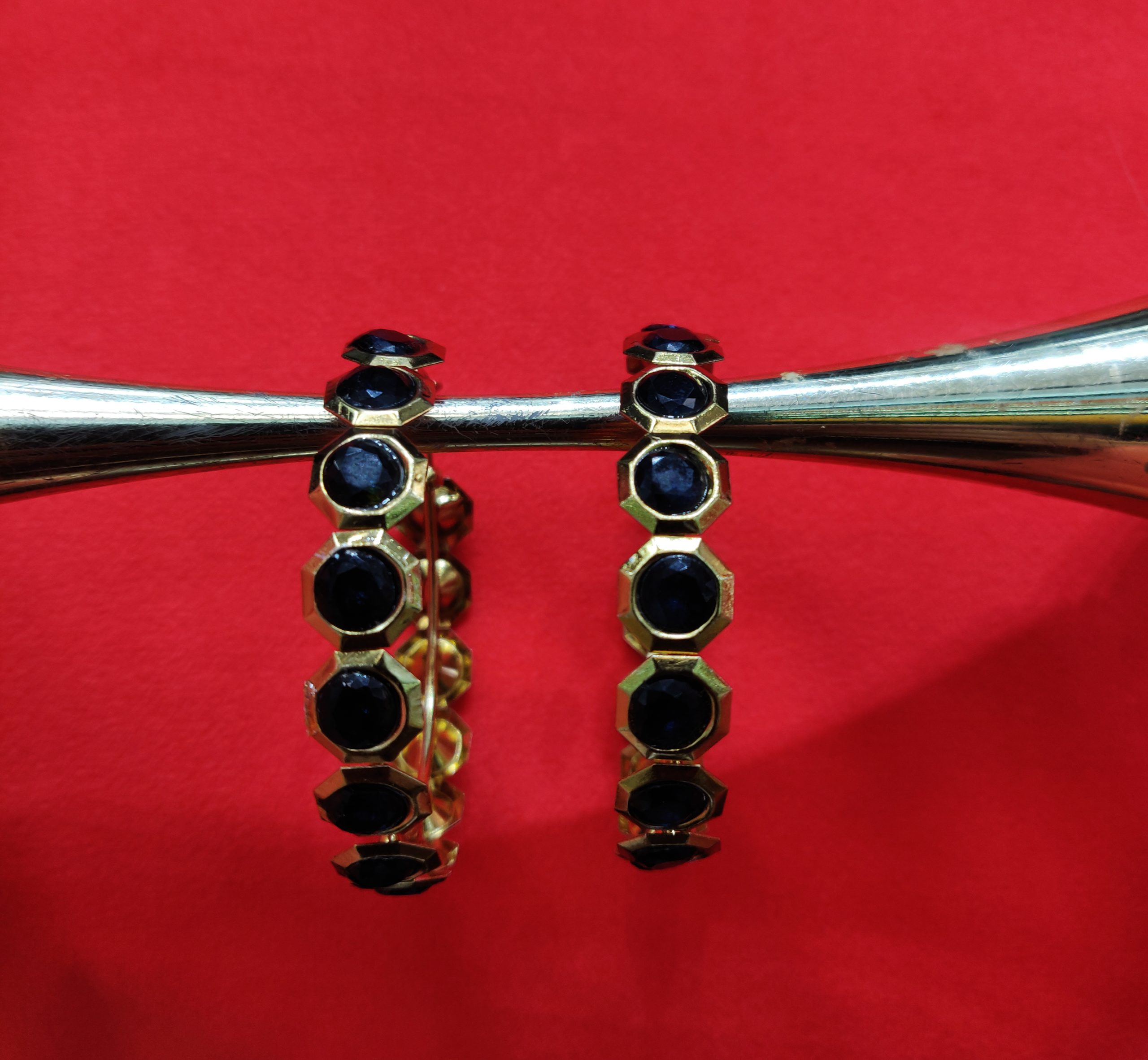 These golden brass hoop earrings are a true embodiment of sophistication and style. Crafted with precision, they feature a lavish array of high-quality black stones that gracefully encircle the entire hoop. The contrast between the rich golden hue of the brass and the deep, alluring black stones creates a striking and timeless design. These earrings are the epitome of elegance and are sure to make a bold and dramatic statement wherever you wear them, adding a touch of glamour and intrigue to any outfit.