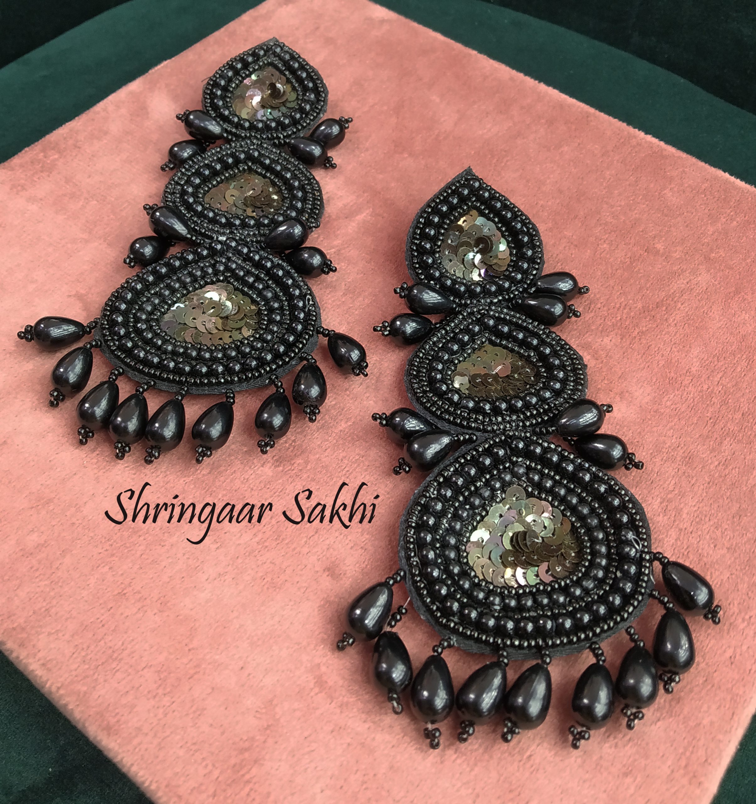 These dramatic black beaded statement earrings feature a layered teardrop design embellished with glistening black sequins and accented by glossy drop beads. The meticulous beadwork and symmetrical pattern create a luxurious texture, making the earrings a captivating accessory for evening wear. Their bold, all-black palette lends a modern, edgy sophistication while maintaining a hint of ethnic charm.