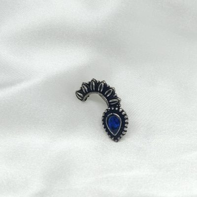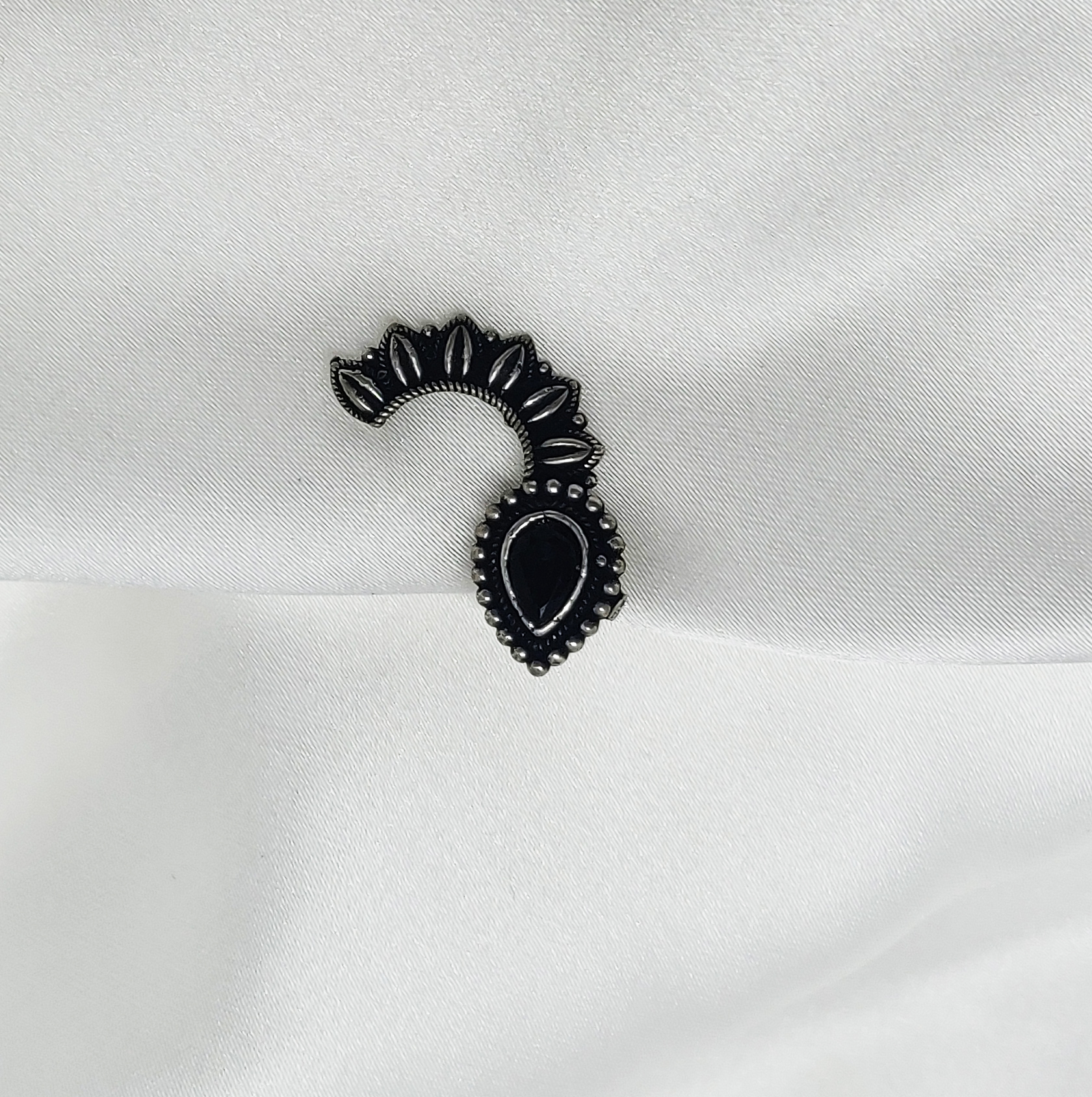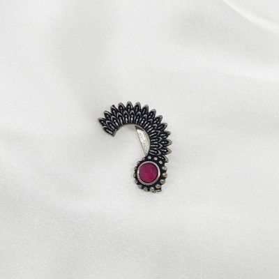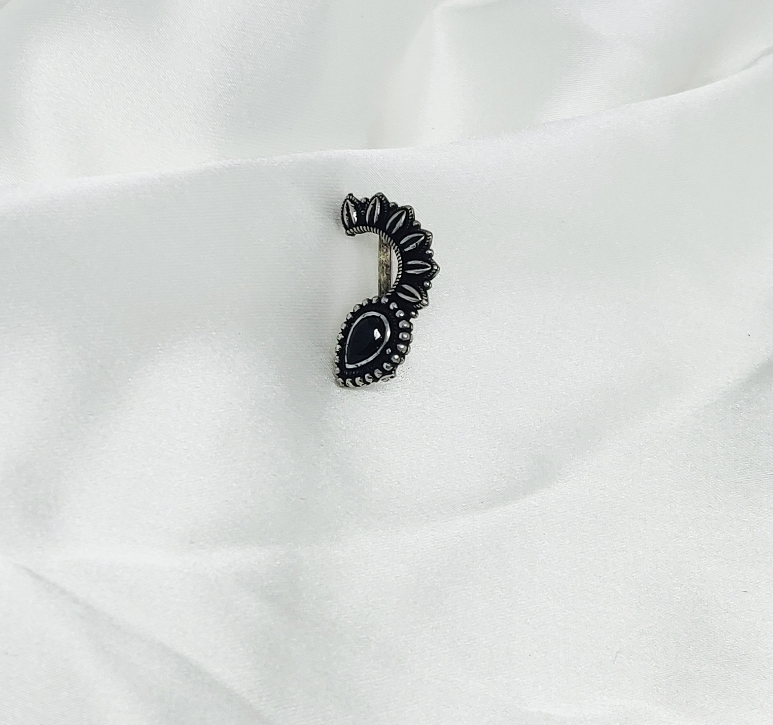 This stunning oxidised Maharashtrian Nath features a unique half-moon curve design adorned with intricate petal-like engravings, leading down to a black stone centerpiece. The oxidised silver finish adds a vintage charm, making it an eye-catching piece rooted deeply in traditional Maharashtrian heritage. Its lightweight and clip-on design make it comfortable and easy to wear, even without a piercing.