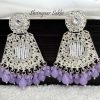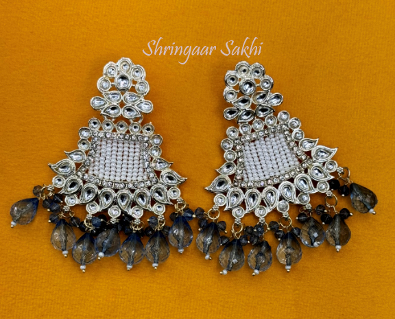 These exquisite earrings combine the sparkle of kundan stones with a delicate grid-like pattern of small beads at the center. The earrings are adorned with pear-shaped crystals and feature smoky grey beads that dangle at the bottom, adding a hint of mystique. The intricate design balances traditional craftsmanship with a contemporary edge, making them an eye-catching accessory.