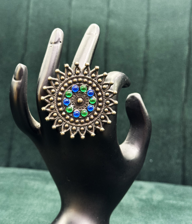 Pair this ring with traditional or Indo-fusion outfits such as sarees, lehengas, or even boho-chic maxi dresses. It works especially well when styled with other oxidized jewelry like jhumkas or layered necklaces. To draw attention to the ring, keep your nails clean or polished in neutral tones. Whether you’re attending a festive celebration or simply want to elevate your everyday ethnic wear, this ring will effortlessly add elegance and cultural depth to your look.