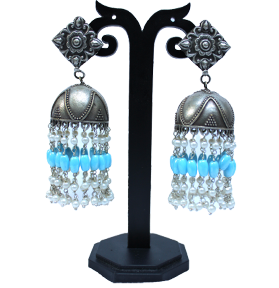 These traditional Jhumka-style earrings feature an antique silver-tone finish with intricate floral and dome designs. They are adorned with white faux pearls and turquoise-blue beads, creating a graceful tiered fringe that adds charm and movement to the piece.