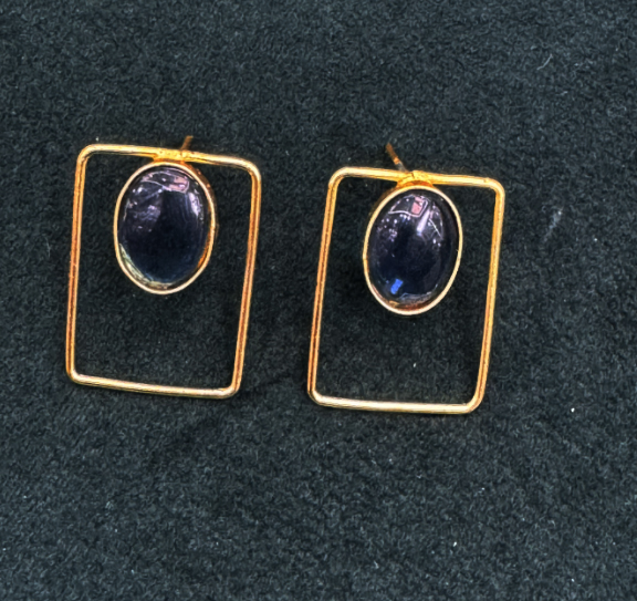 These elegant Shringaar Sakhi earrings feature a sleek rectangular gold frame with a bold black oval stone at the center. The combination of geometric design and a classic dark stone creates a sophisticated, modern accessory perfect for adding understated style to any outfit.