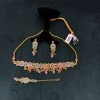 This bold necklace set features round black carved stones encased in elegant gold frames, surrounded by a sparkling layer of kundan stones. The matching earrings carry the same design, creating a cohesive and striking look. The combination of deep black and gold offers a perfect balance of traditional craftsmanship with a modern edge, making this set ideal for festive occasions, evening events, or cultural celebrations.
