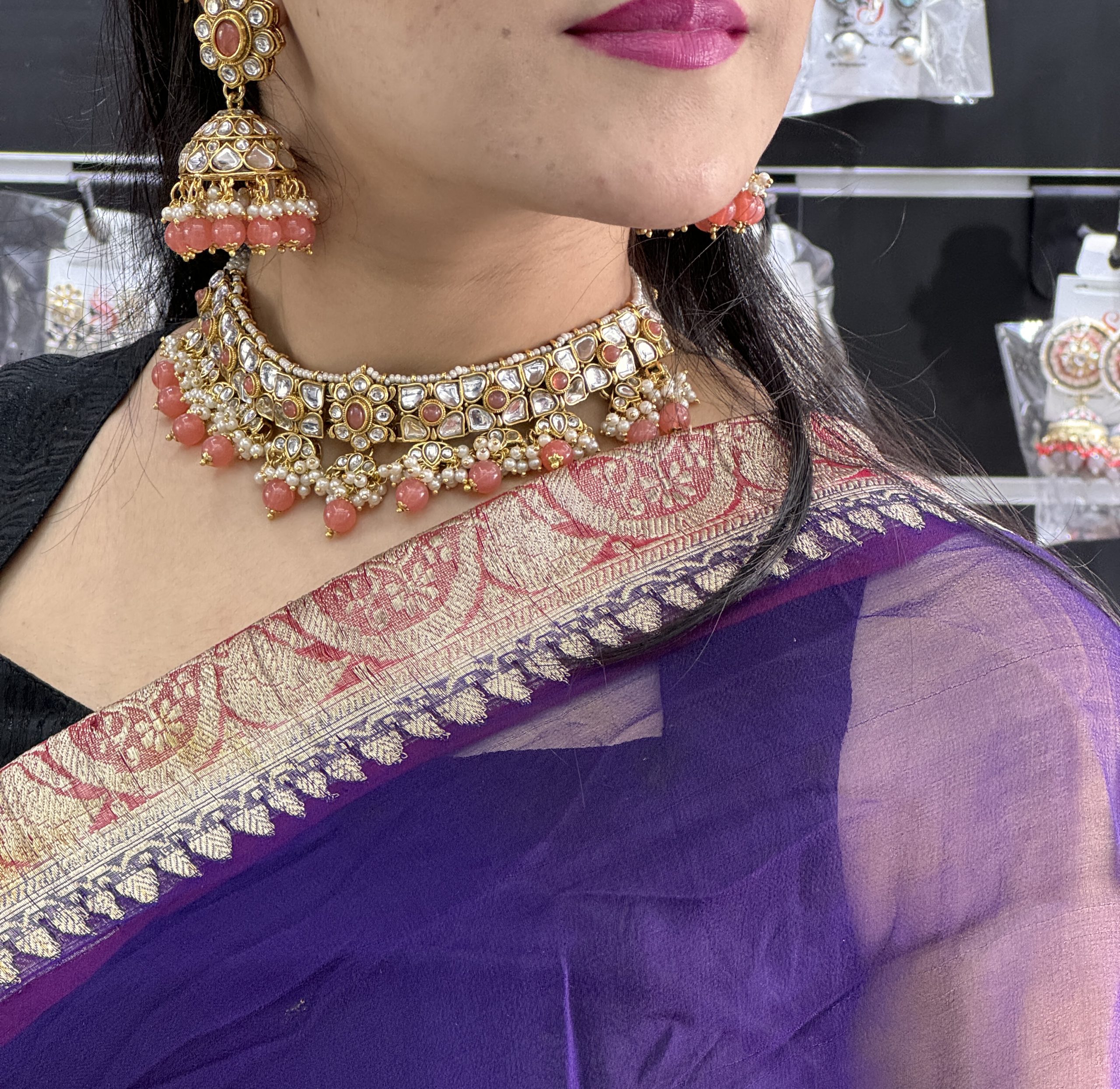 The coral beads of this combo set add a refreshing pop of color, ideal for pairing with pastel or neutral-toned sarees, lehengas, or anarkalis in shades like peach, cream, or gold. For a bold contrast, you can pair it with deep hues like bottle green, royal blue, or burgundy to make the coral beads stand out even more. This set is great for festive occasions or weddings. Style it with a low bun or soft curls, and complement it with glowing makeup and a hint of coral or peach tones to match the jewellery’s color.
