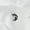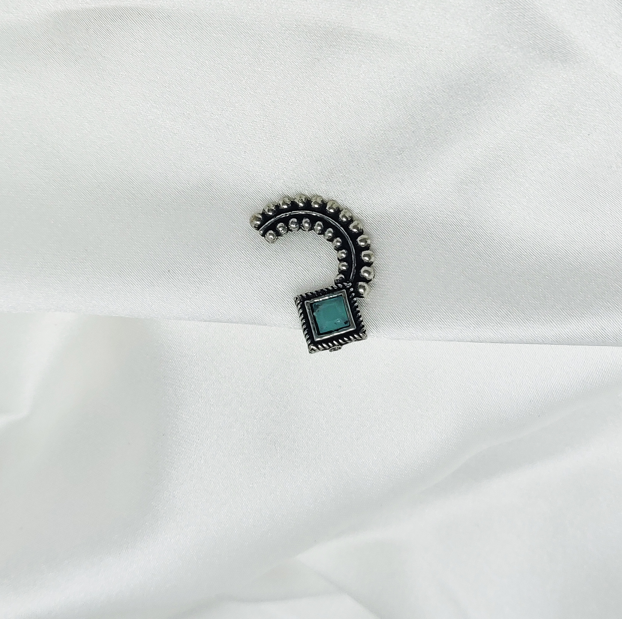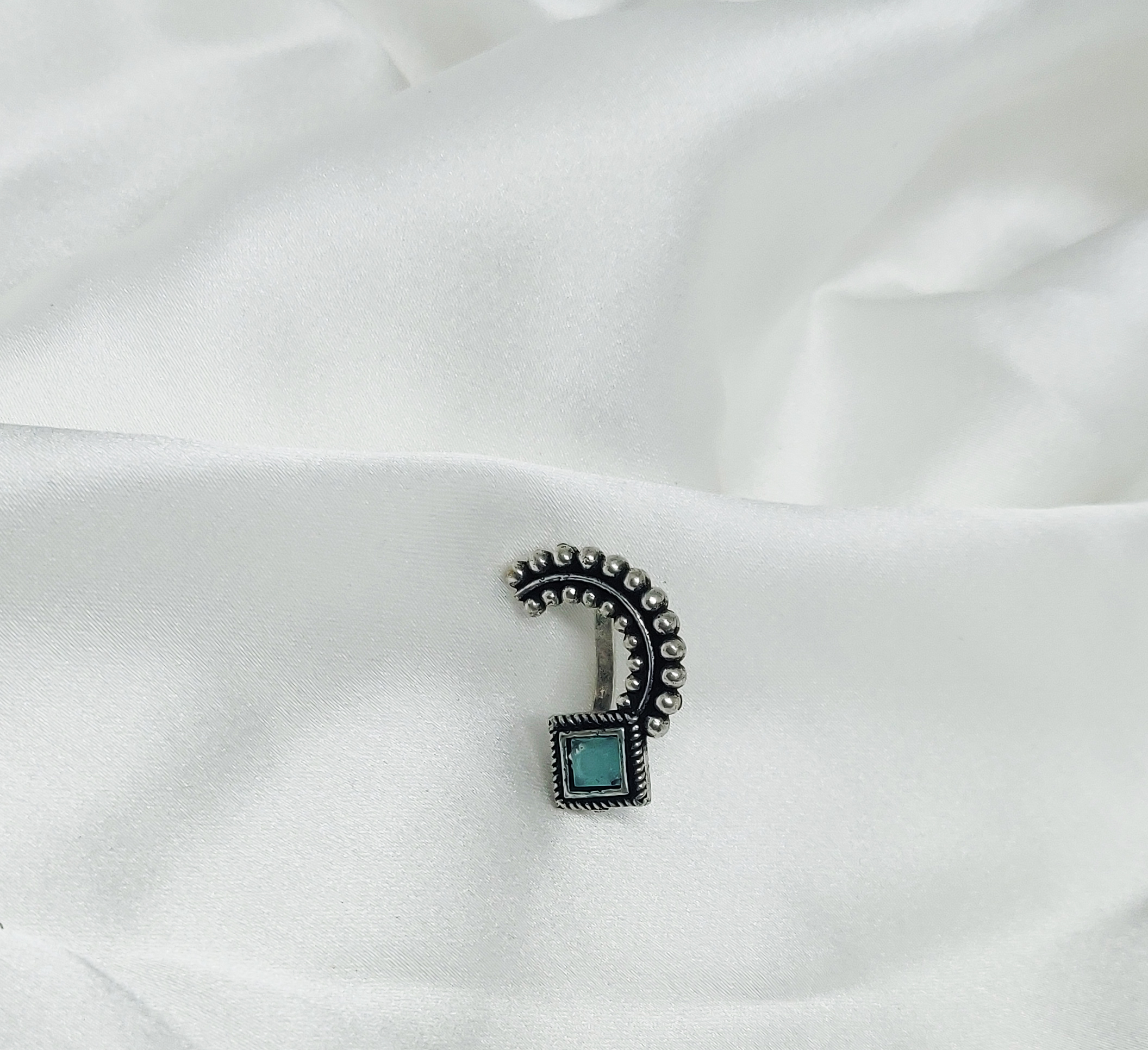 This stunning oxidised Maharashtrian Nath features a unique half-moon curve design adorned with intricate petal-like engravings, leading down to a cyan stone centerpiece. The oxidised silver finish adds a vintage charm, making it an eye-catching piece rooted deeply in traditional Maharashtrian heritage. Its lightweight and clip-on design make it comfortable and easy to wear, even without a piercing.