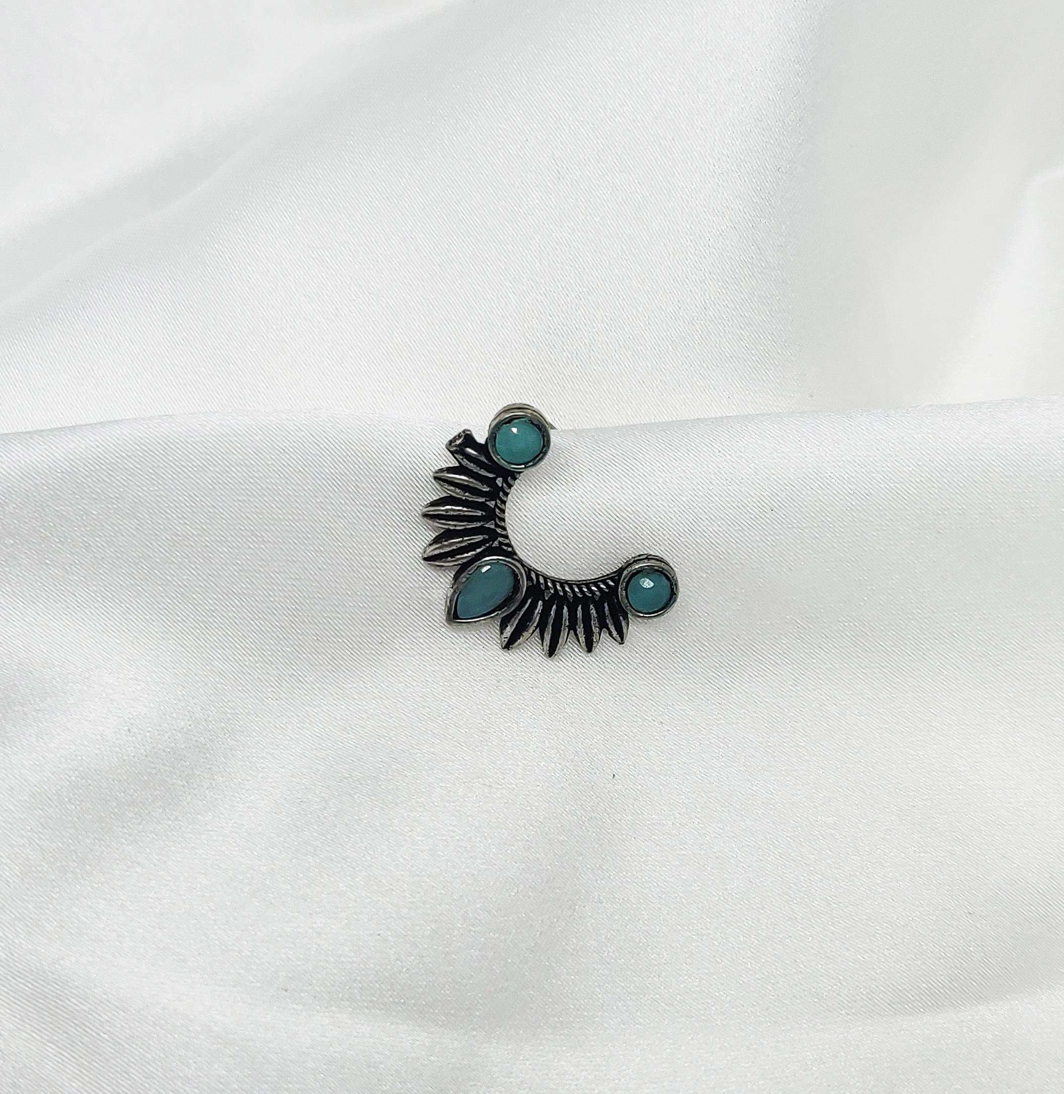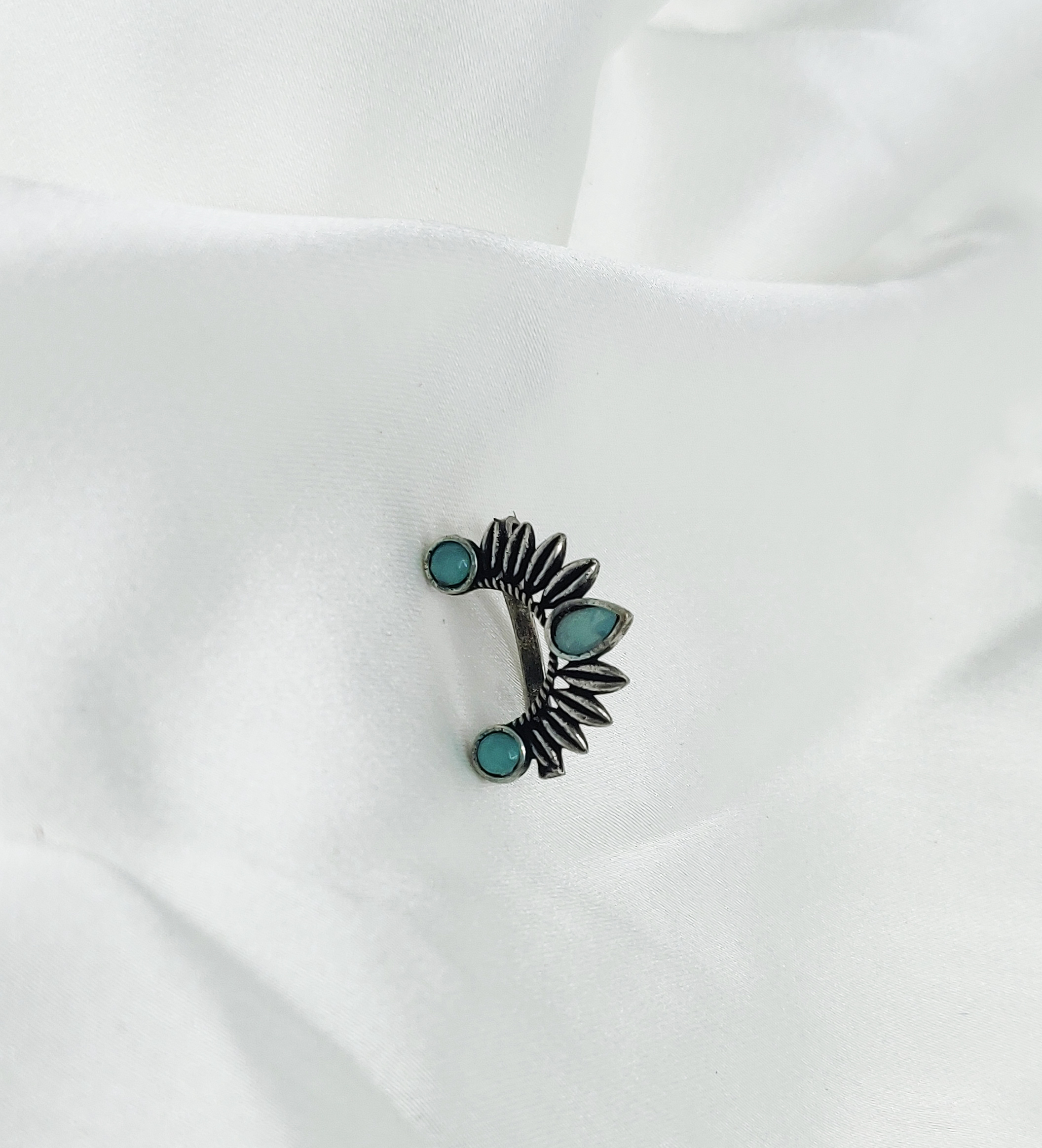 This oxidised Maharashtrian Nath showcases a graceful crescent shape adorned with oxidised petal motifs and vibrant turquoise-blue stones. The combination of antique silver and cool-toned stones gives it a fresh and artistic appeal while staying rooted in traditional Maharashtrian culture. Its clip-on mechanism makes it hassle-free to wear for those without nose piercings.