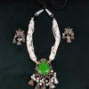 This stunning tribal necklace with a dark green centerpiece exudes a richer, deeper elegance—perfect for festive evenings and cultural gatherings. Style it with earthy-toned outfits like beige, deep rust, charcoal black, or ivory to let the green stone pop. It pairs beautifully with handloom sarees, khadi kurtas, or flowy boho dresses for an effortlessly chic, ethnic look. Keep your hairstyle simple with a sleek bun or soft waves, and go for makeup with bronze eyes and a bold lip to complement the darker stone. Let the necklace take center stage by keeping other accessories minimal, and finish the look with rustic juttis or Kolhapuris and an oxidized clutch.