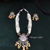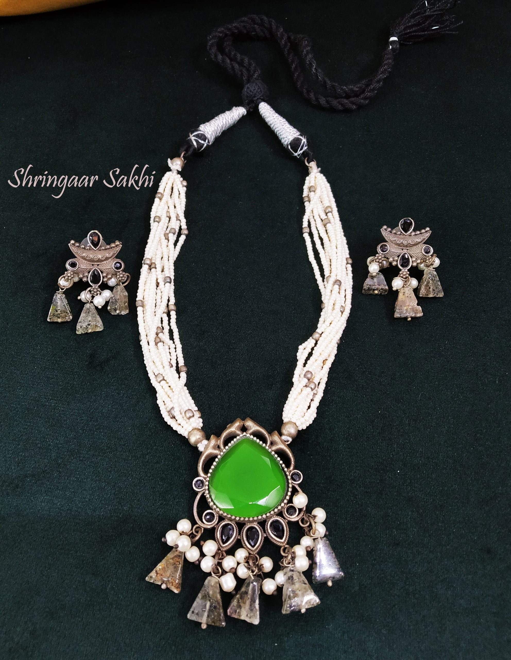 Make a bold statement with this tribal-inspired set from Shringaar Sakhi, featuring a striking dark green stone centerpiece, multi-strand seed beads, and oxidized charms. Paired with matching earrings, this set adds earthy elegance to sarees, kurtas, and Indo-western looks. Perfect for festive or cultural occasions. 🌿 Boho Vibes | Handcrafted Elegance