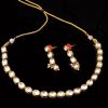 This Kundan necklace set is a beautiful and versatile piece of jewelry that can be paired with a wide range of colors and outfits, so don’t be afraid to experiment and find what works best for your personal style and the occasion. A black outfit would create a striking contrast with the green emerald necklace set. A black cocktail dress or black jumpsuit would be a great choice for a formal event.A white outfit would make the emerald necklace set stand out. A white blouse and pants or a white dress would be perfect. A gold dress or a gold blouse and skirt would work well for a any event.Navy blue is a complementary color to emerald green and would create a harmonious look with the necklace set. A navy blazer paired with dress pants or a navy dress would be perfect for a business or formal event.Peach is a soft and feminine color that would complement the emerald green. Silver is another color that complements emerald green.