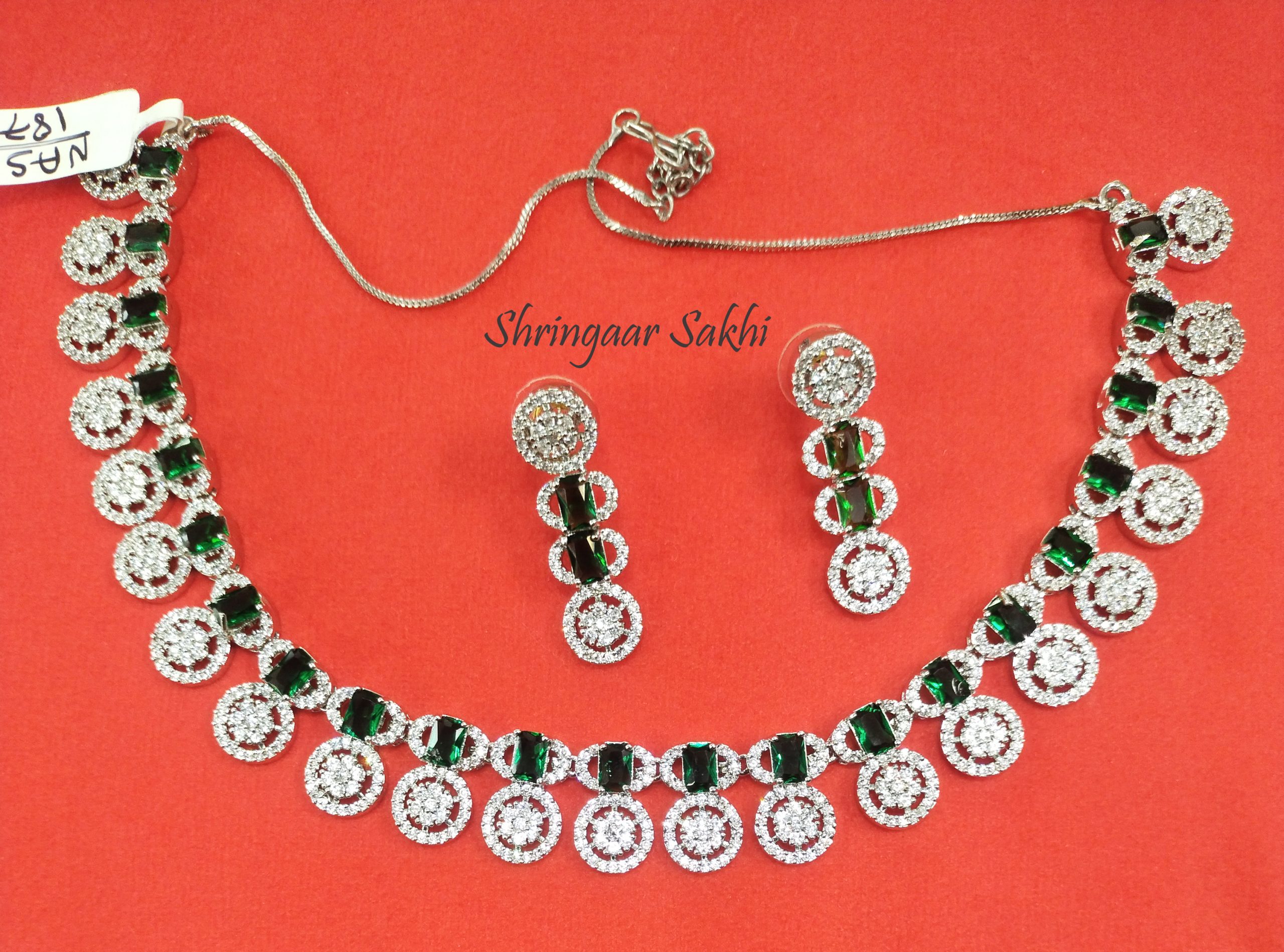 This stunning necklace set features a luxurious combination of deep emerald-green stones and dazzling round silver American diamonds, making it a timeless and elegant statement piece. The symmetrical pattern of alternating green and silver elements creates a regal look, perfect for weddings, evening receptions, or festive celebrations. The matching earrings complement the necklace beautifully, adding just the right amount of sparkle and sophistication to your ensemble.