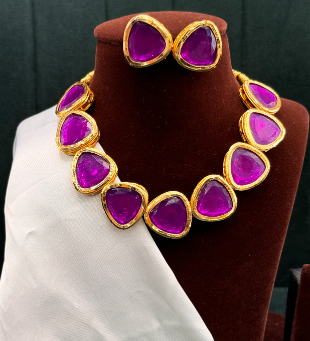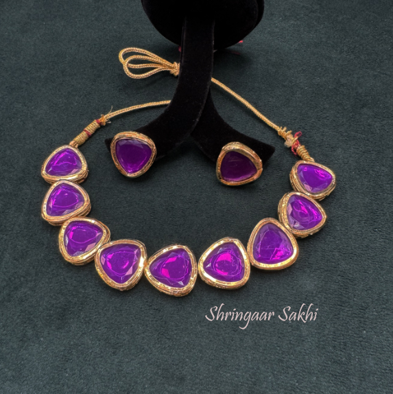 This bold and vibrant necklace features a series of large, triangular-shaped purple stones set in gold frames, creating a striking contrast. The simplicity of the design allows the deep purple stones to stand out, offering a modern yet traditional appeal. Ideal for festive occasions, weddings, or evening events, this necklace is a statement piece that can elevate any ethnic outfit with its bold color and elegant design. The craftsmanship in this set ensures a timeless appeal, making it a statement piece for any ethnic outfit.