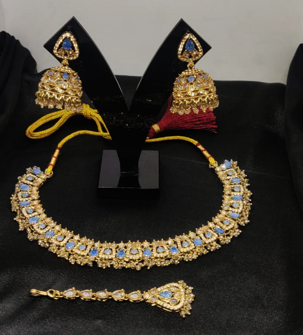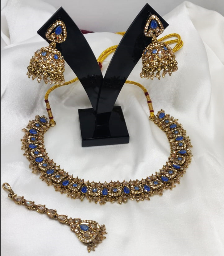 This regal necklace set features an ornate design highlighted by striking blue teardrop stones, complemented with shimmering kundan work in a rich antique gold finish. The matching jhumka earrings are grand and intricate, with dangling beads that enhance their traditional charm. A matching maang tikka completes the ensemble, making it perfect for creating a cohesive and luxurious bridal or festive look.