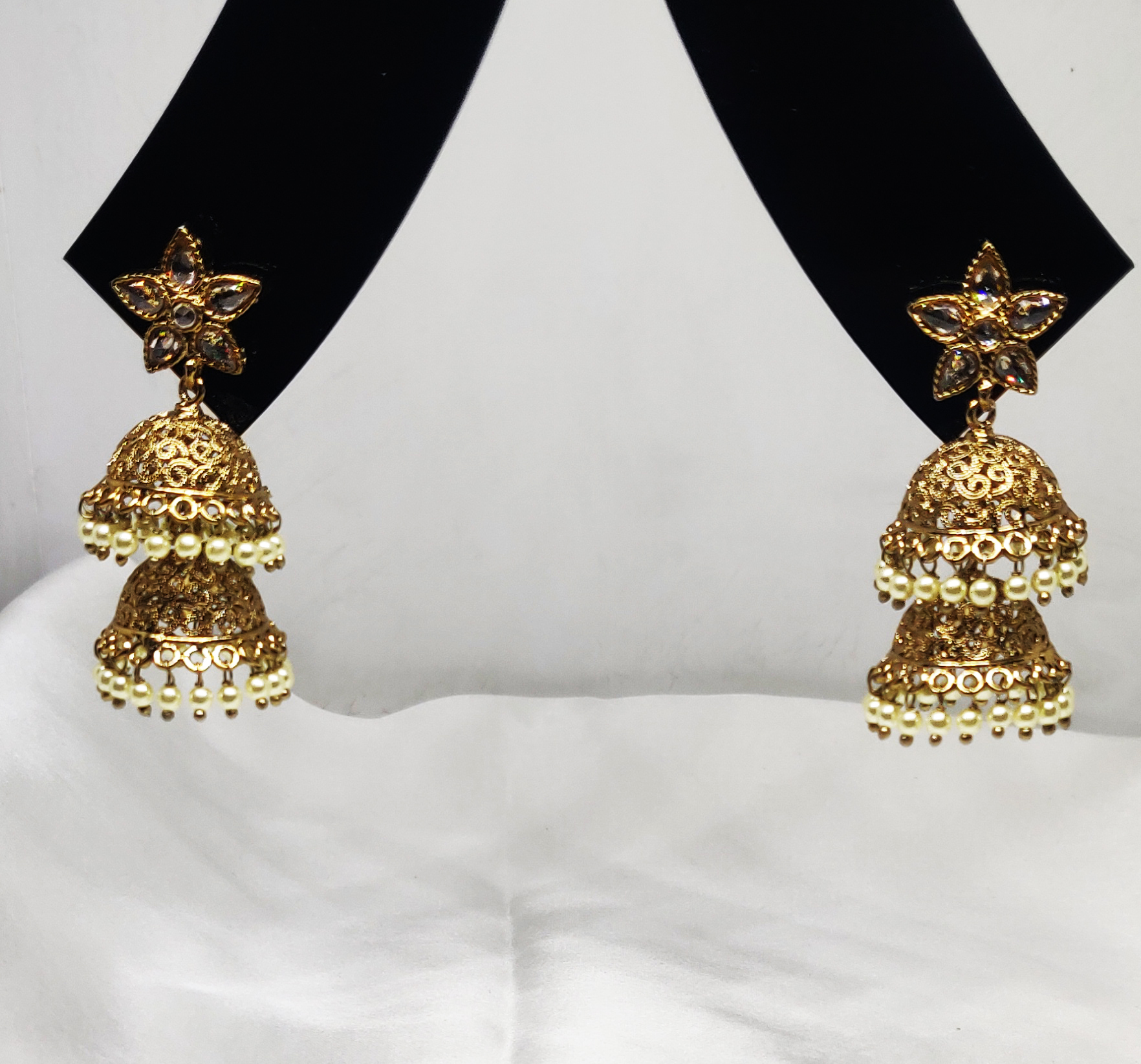 These elegant earrings showcase a classic double-jhumka design, intricately crafted in antique gold with delicate floral patterns and a filigree finish. The floral stud at the top is studded with kundan-style white stones, while the twin domes below are adorned with tiny pearl hangings that enhance the traditional charm. The tiered structure adds dimension and movement, giving the piece a timeless appeal perfect for ethnic wear lovers.