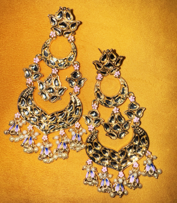 These earrings feature a traditional kundan design enhanced with delicate pink floral accents and pearly drops. The intricate detailing with crescent shapes and reflective kundan stones gives them a regal, ornate appeal. The addition of lilac-colored crystals at the bottom adds a modern, playful twist to the traditional aesthetic.