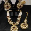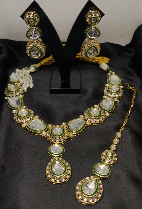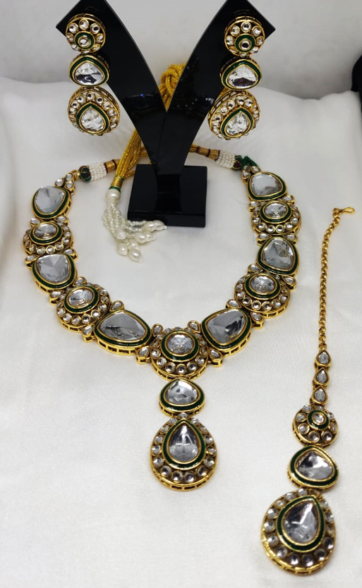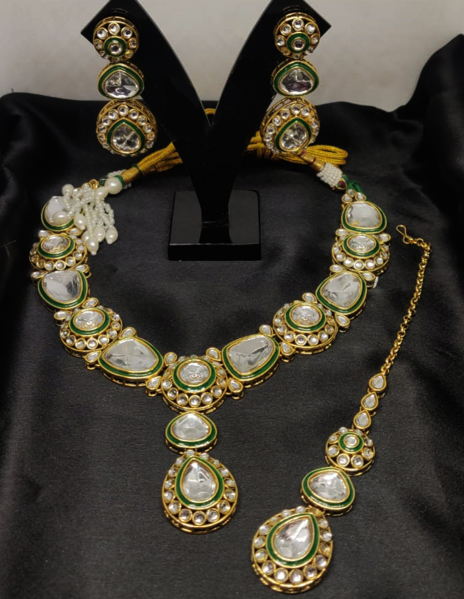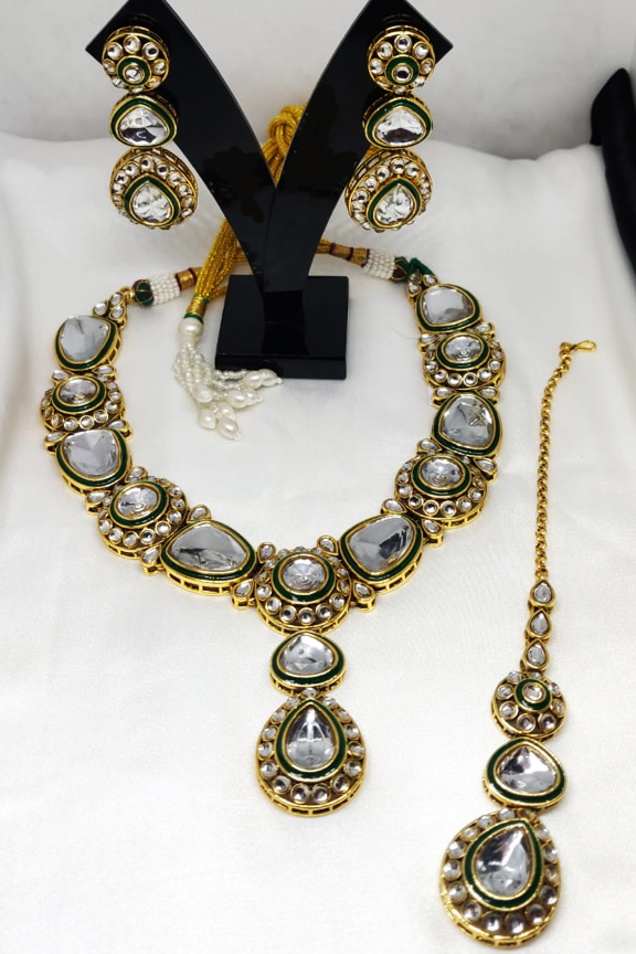 This exquisite Kundan jewelry set features a regal combination of pear-shaped and round uncut stones, delicately bordered in green enamel and encased in gold-tone frames. The set includes a statement necklace, matching earrings, and a coordinating maang tikka, all adorned with glistening kundan work and dainty pearl accents. The rich detailing and traditional craftsmanship make it a timeless piece for any ethnic wardrobe.