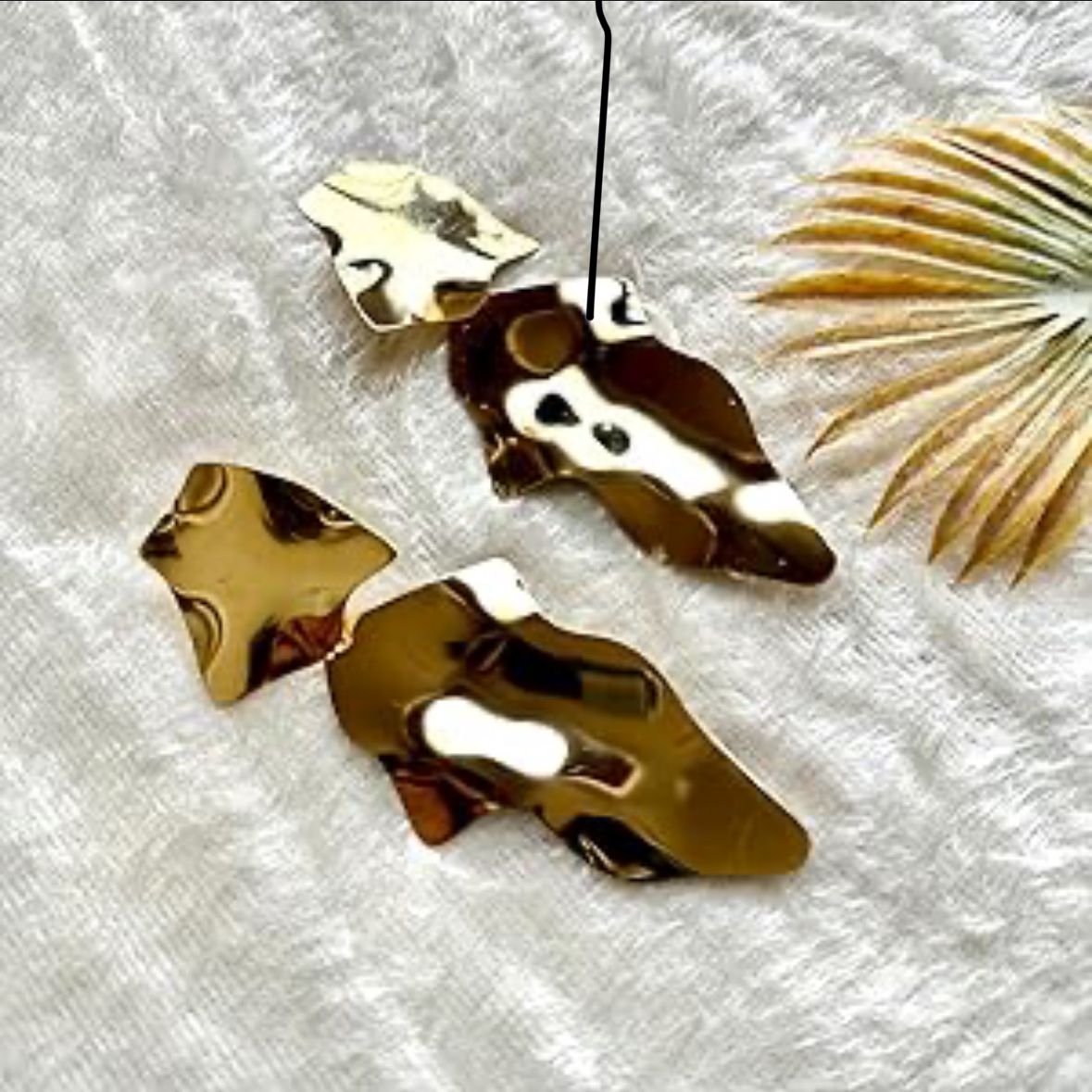 These gold-toned sculptural drop earrings are a stunning representation of contemporary design. Featuring fluid, asymmetrical forms with a high-gloss, mirror-like finish, they resemble abstract molten metal art pieces. Their dual-part construction creates a sense of movement, catching and reflecting light in dynamic ways. Perfect for those who appreciate avant-garde jewelry, these earrings are more than accessories—they’re wearable statements of creativity and bold self-expression.