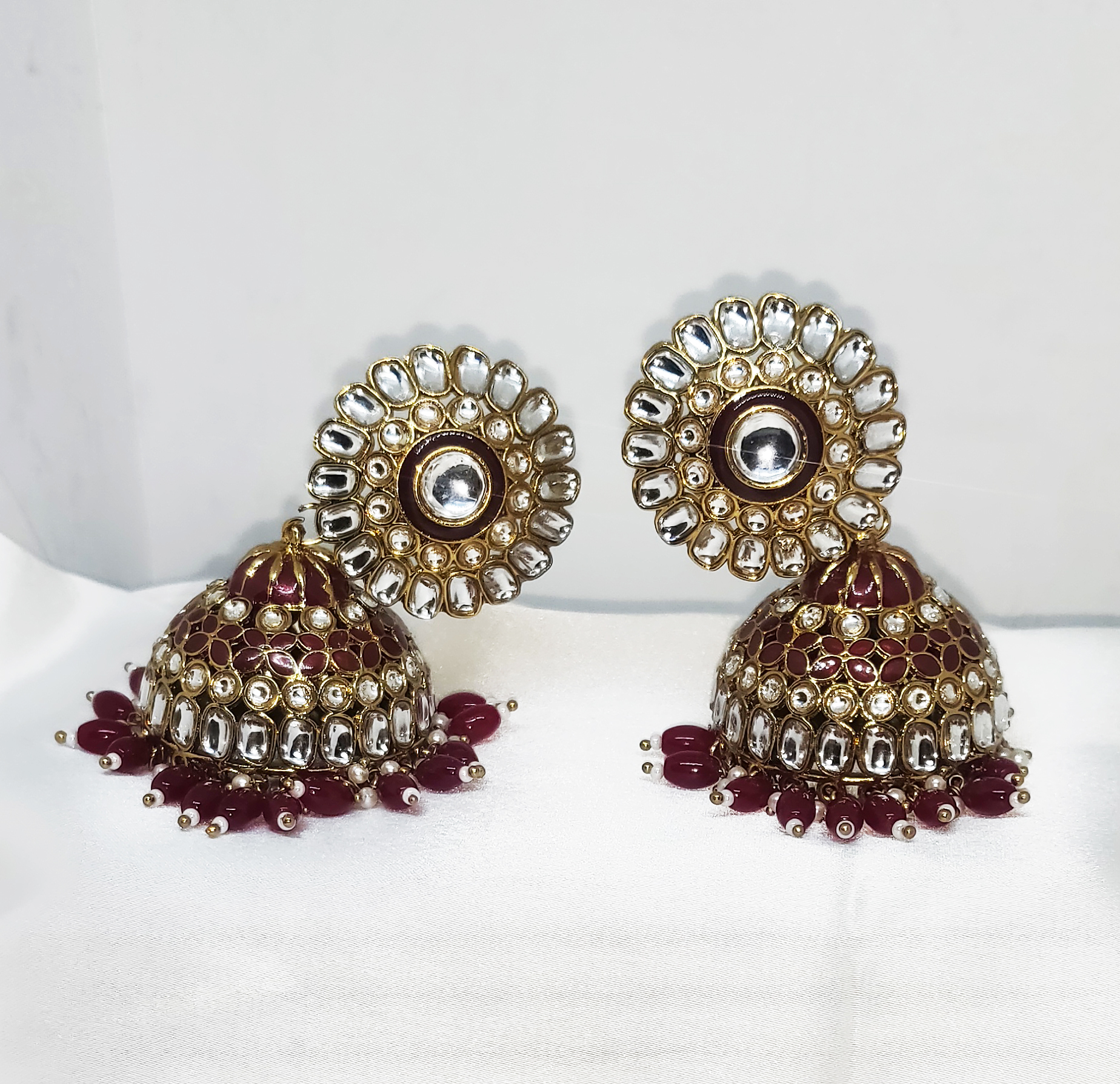 These traditional jhumka earrings showcase an exquisite blend of intricate meenakari work in rich maroon and gold tones, complemented by shimmering white kundan stones. The dome-shaped jhumkas are adorned with layers of bead drops in deep maroon, adding movement and festive charm to the design. The circular stud top, encrusted with kundan stones in a floral pattern, gives the earrings a regal touch perfect for any grand occasion.