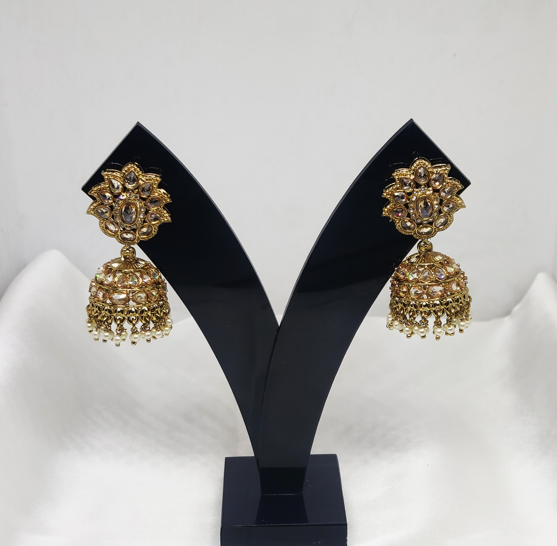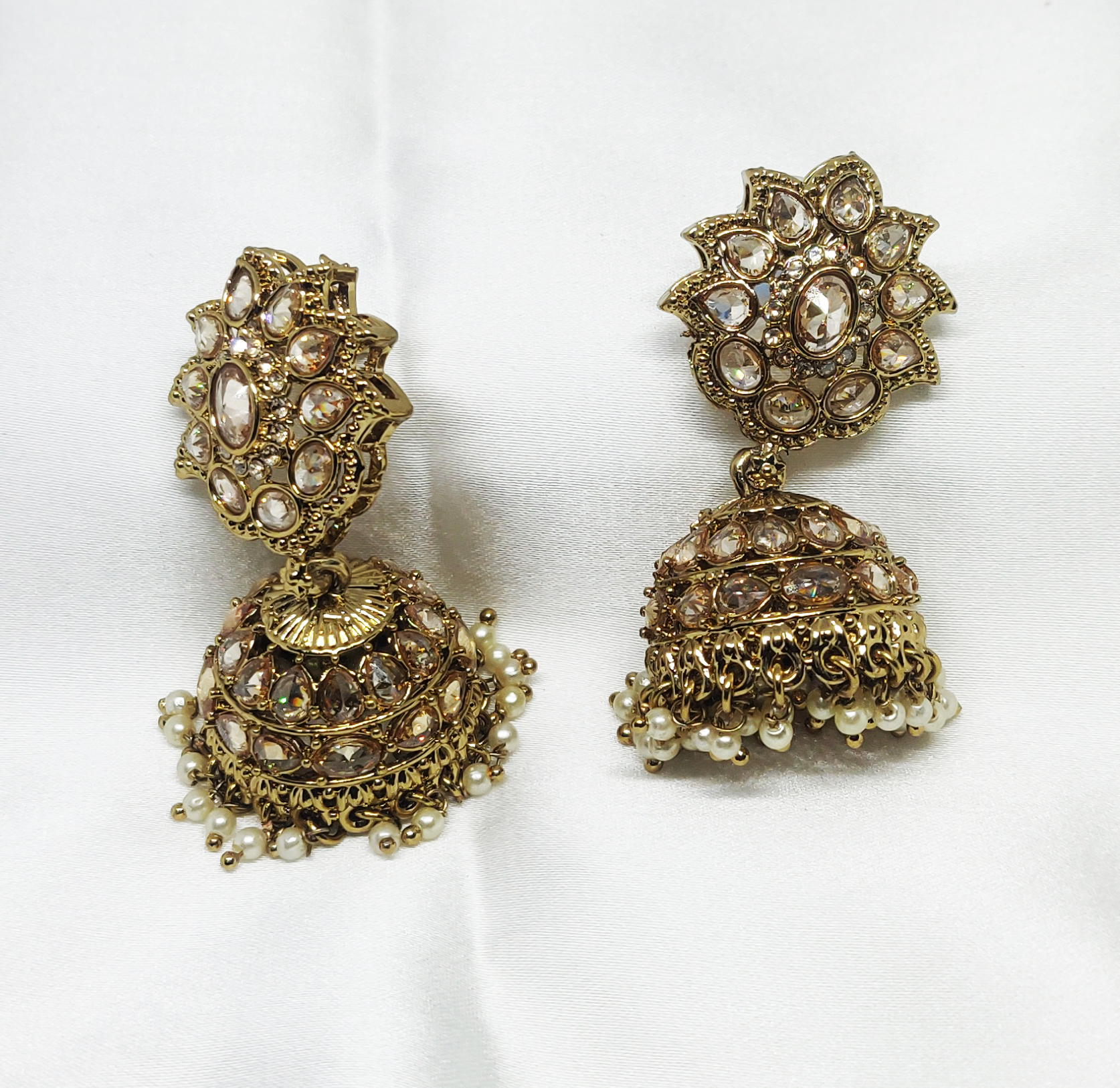 These grand and intricately designed earrings feature a regal lotus-shaped stud fully encrusted with white kundan stones, paired with a layered jhumka dome beneath. The antique gold finish gives them a vintage allure, while the clusters of pearl drops at the base of the jhumkas add an extra layer of delicacy and movement. The craftsmanship speaks to traditional Indian jewelry aesthetics, making these earrings ideal for weddings and festive gatherings where grandeur is key.