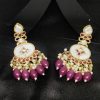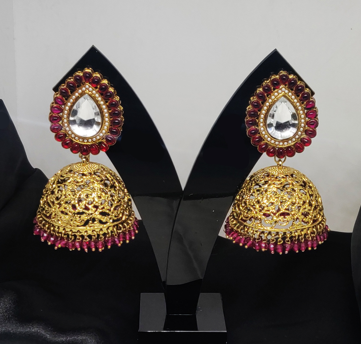 These bold and luxurious jhumka earrings feature a dramatic teardrop-shaped stud encrusted with a large mirror-like stone surrounded by deep ruby-red stones. The large golden dome below showcases intricate filigree detailing and is finished with a beautiful fringe of pink crystal beads. The combination of gold, red, and pink gives the earrings a vibrant royal appeal, making them ideal for grand celebrations and traditional festivities.