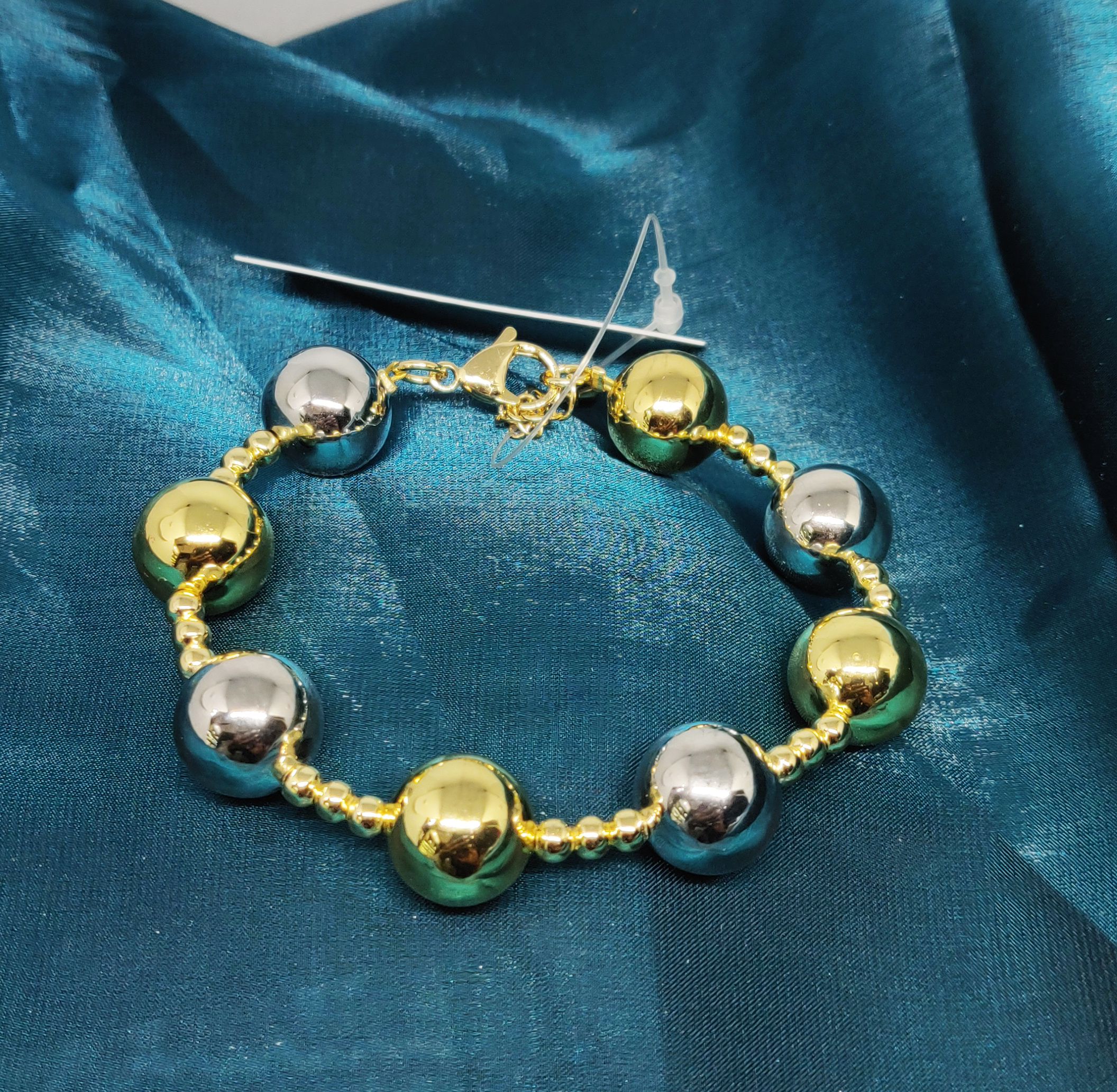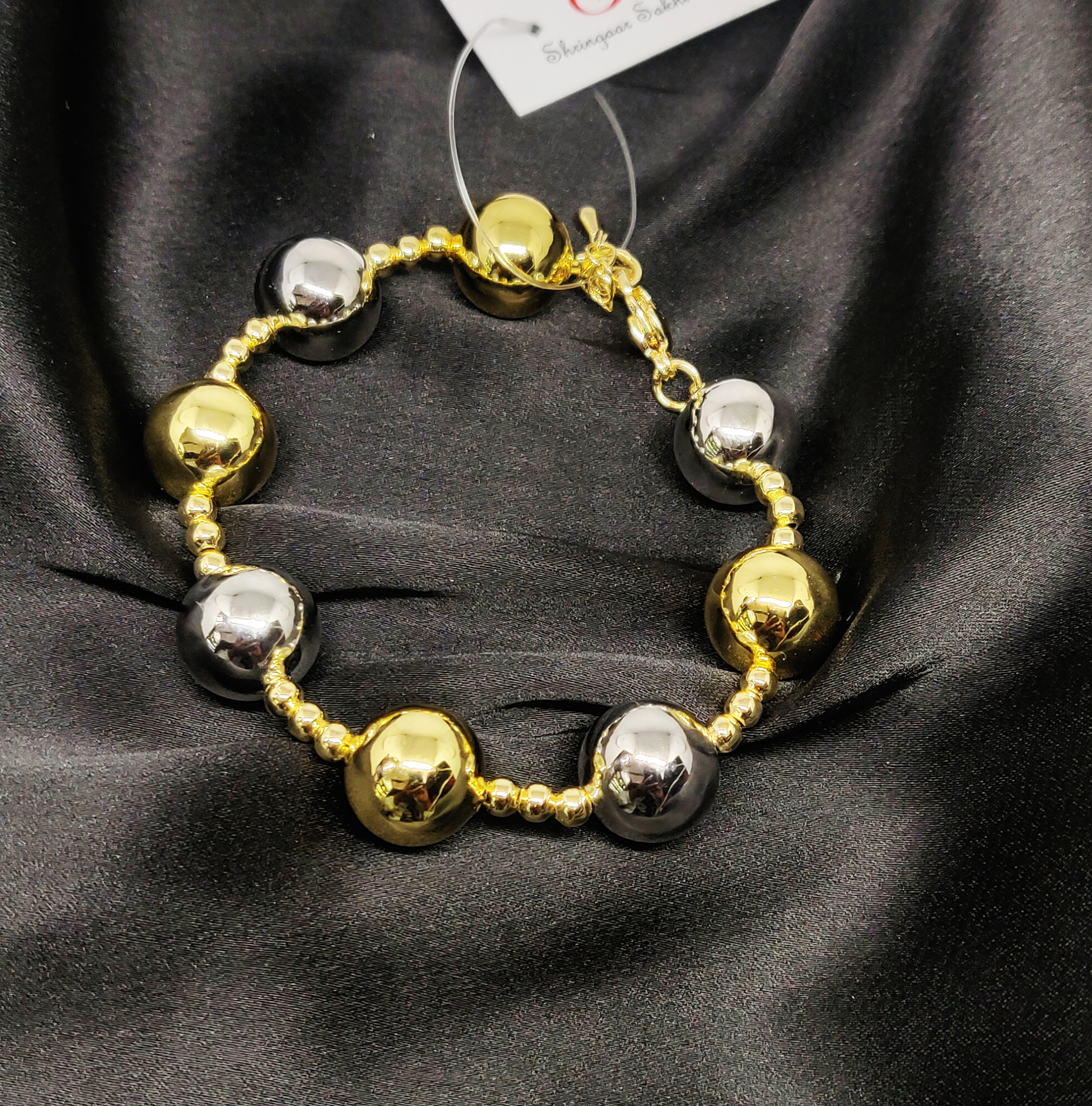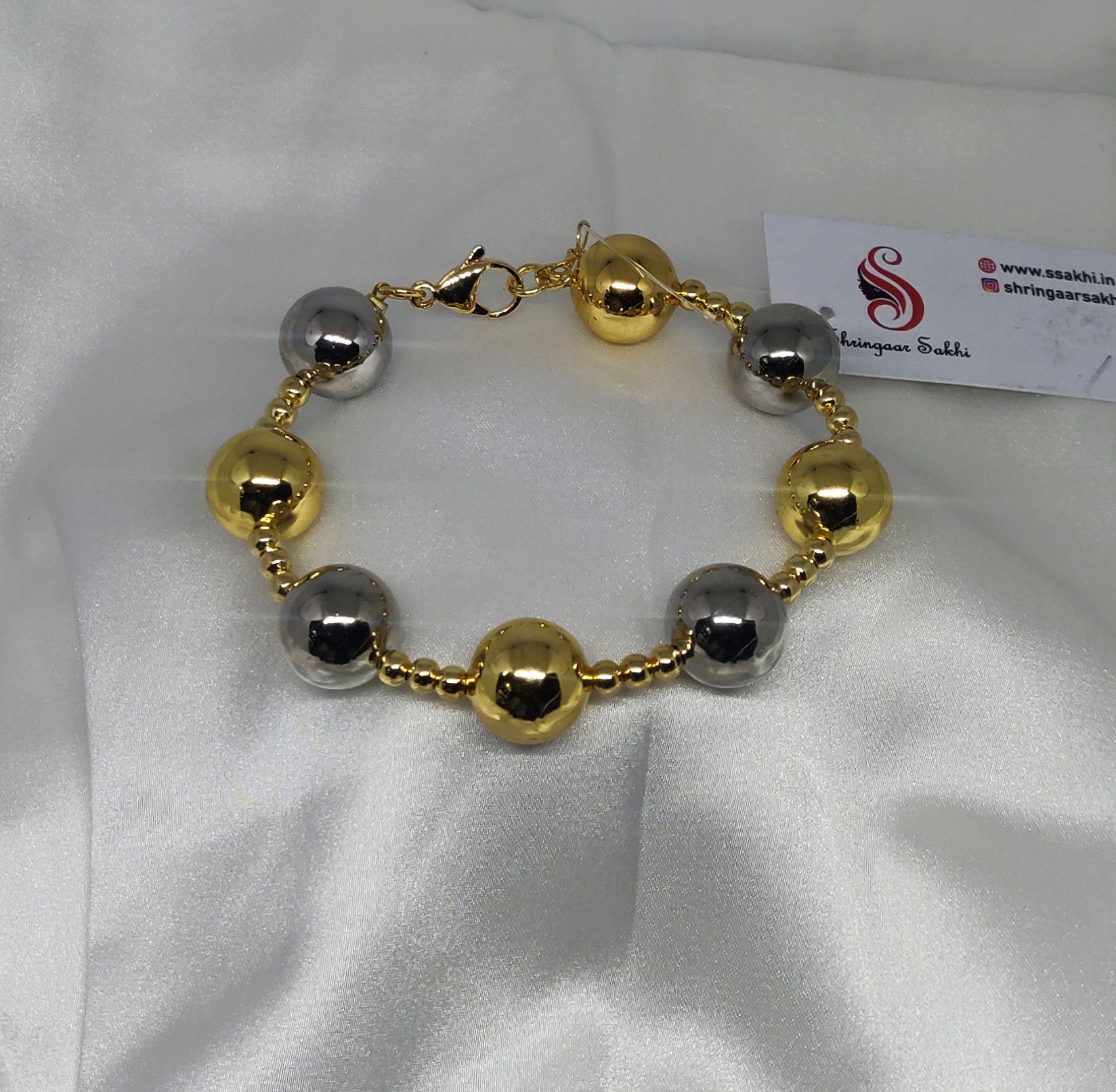 Elevate your style with this chic and modern dual-tone beaded bracelet from Shringaar Sakhi. Featuring alternating gold and silver polished spheres in varying sizes, this bracelet is the perfect blend of boldness and minimalism. The adjustable chain with a secure clasp ensures a snug and stylish fit for any wrist. Its elegant design makes it a timeless piece to add glamour to any outfit.