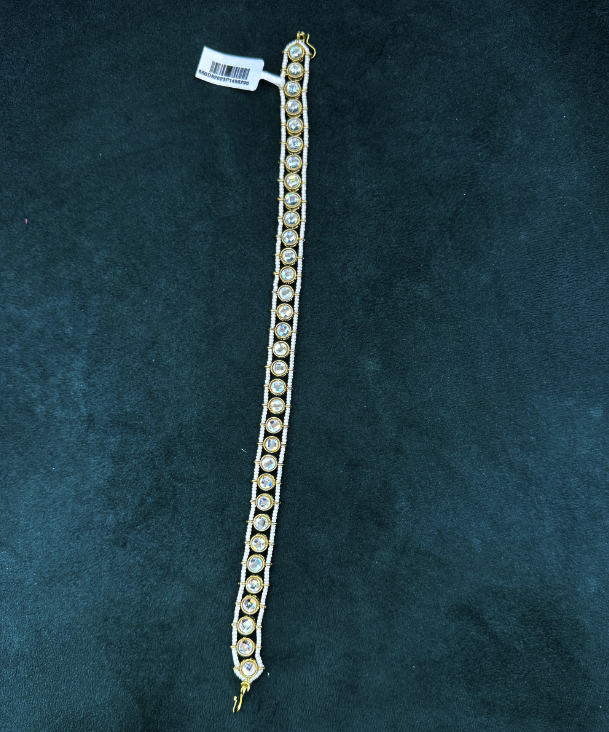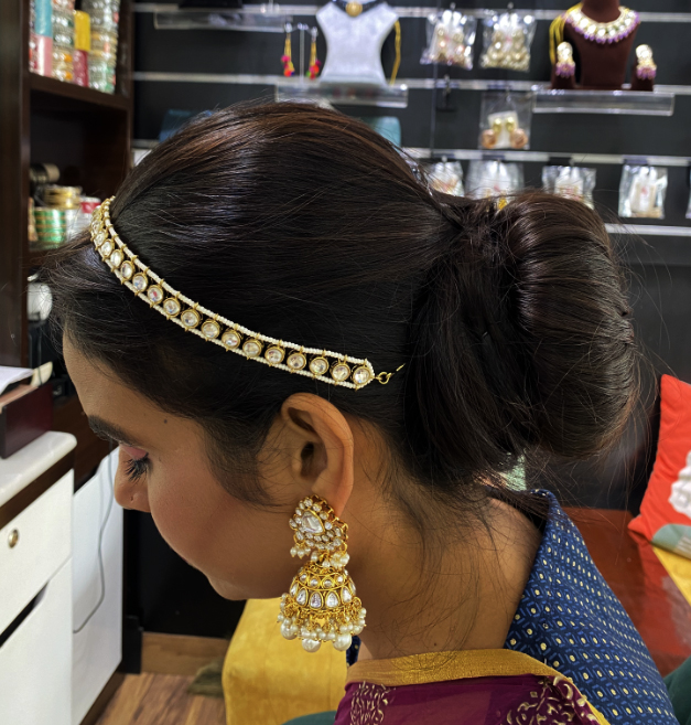 This sophisticated matha patti showcases a single strand of sparkling kundan stones, set in a rich gold base with uniform symmetry and a polished finish. The clean and linear design elegantly frames the crown of the head, making it an ideal pick for those who prefer a more minimal yet regal look. Its sleek style is perfect for enhancing traditional hairstyles like buns or braids.