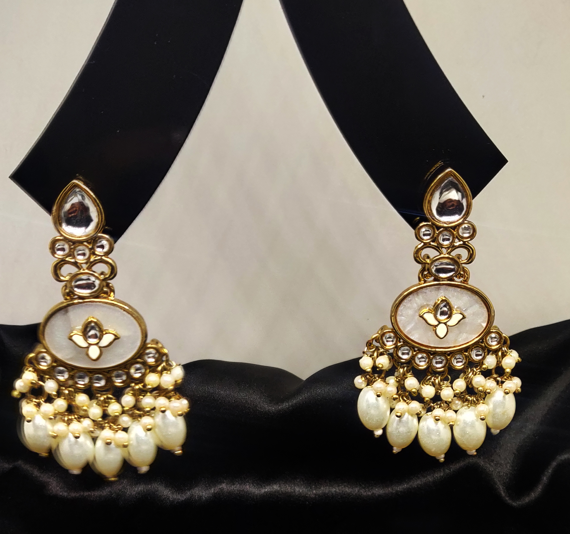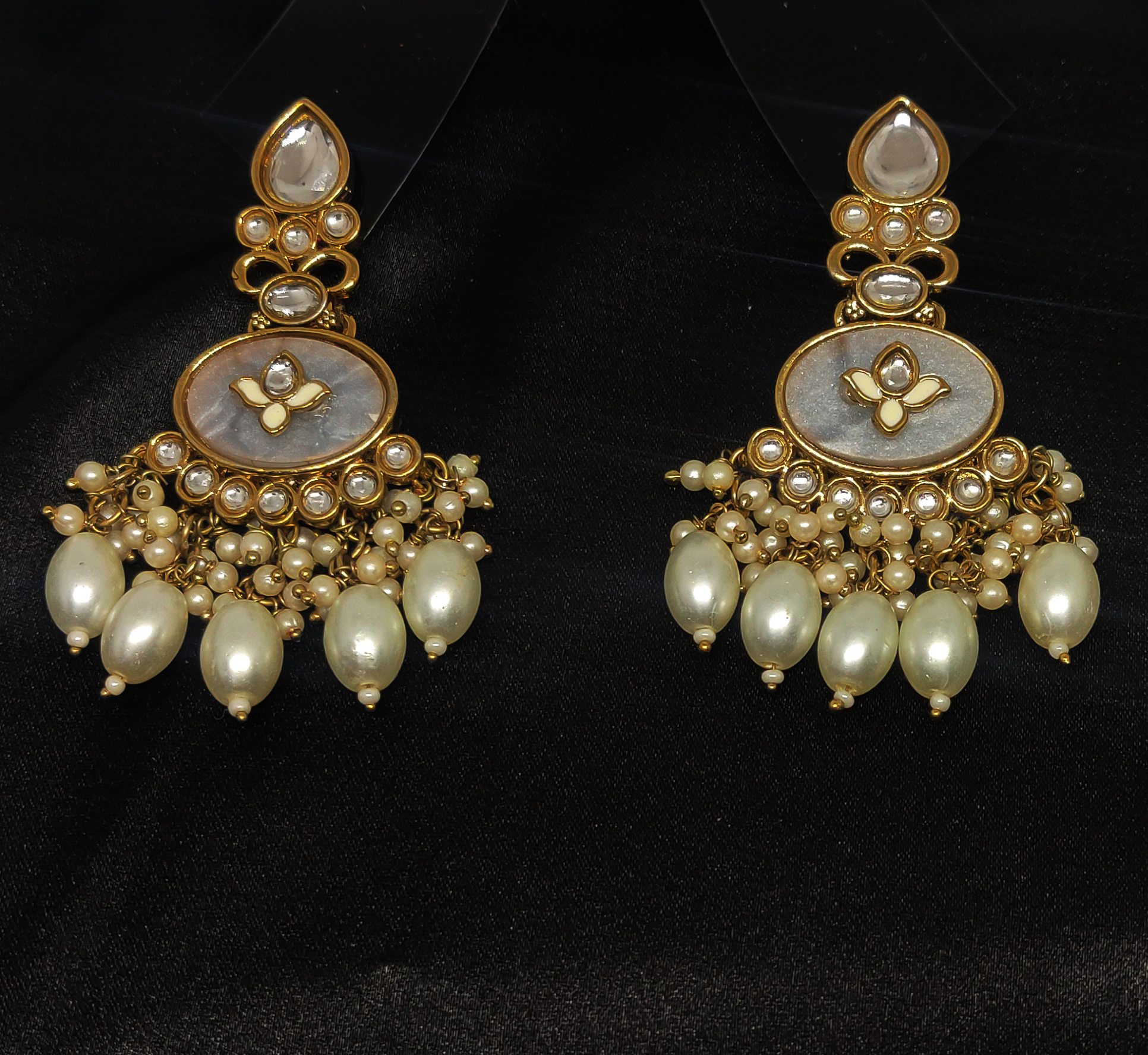These elegant earrings blend classic charm with regal detailing. The top features a teardrop-shaped kundan stone followed by a mix of circular and oval kundan elements, leading to a central oval enamel base adorned with a delicate golden floral motif. The lower half is beautifully fringed with creamy pearl beads and clustered mini pearls, giving the earrings a graceful sway and a soft, traditional touch. The neutral palette of ivory and gold enhances their versatility and timeless appeal.