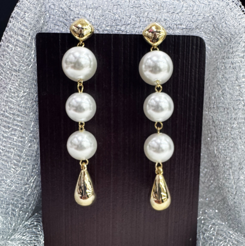 This elegant pair of earrings features a linear arrangement of three lustrous faux pearls, descending gracefully from a textured gold stud. The design is finished with a sleek gold teardrop charm at the bottom, adding a sophisticated flourish and subtle movement. The blend of pearl sheen and golden accents gives the earrings a refined and timeless appeal, perfect for both traditional and modern wardrobes.