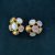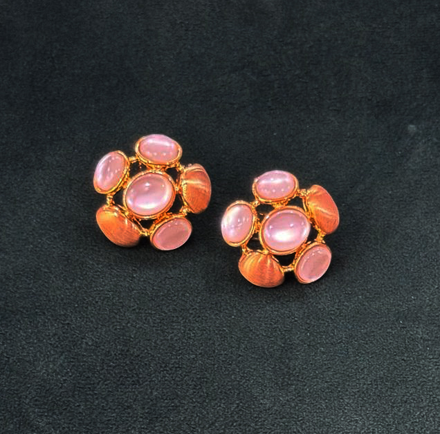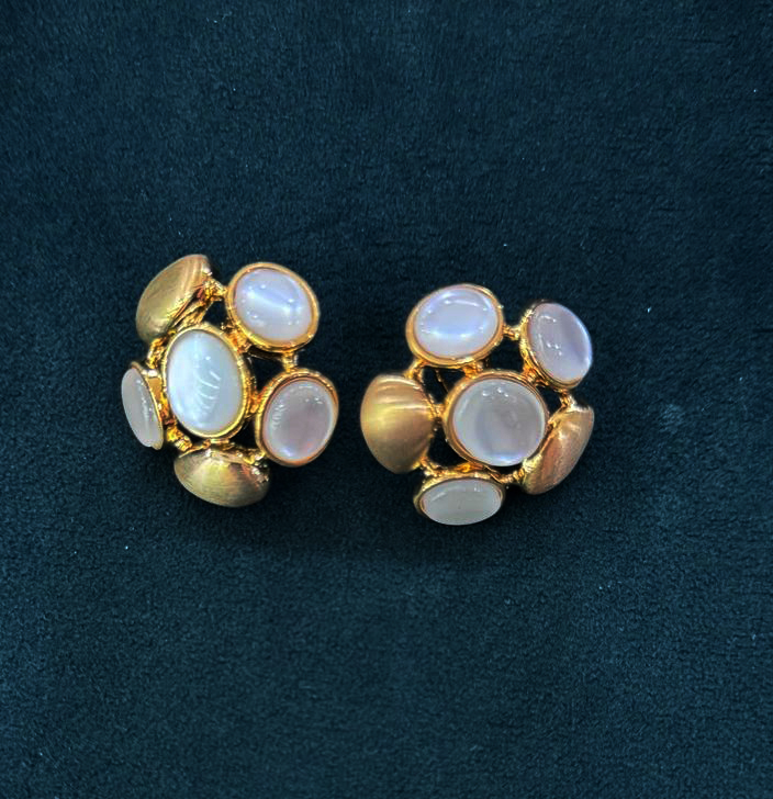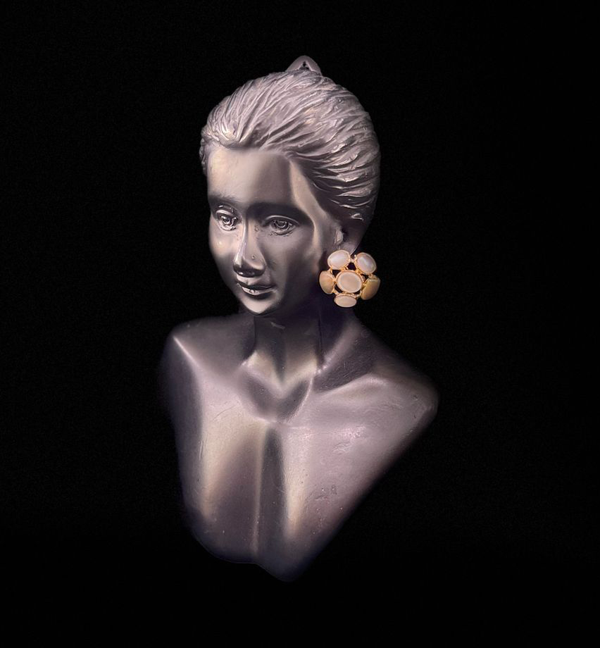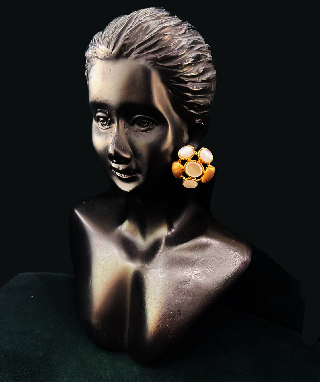 These statement earrings feature a cluster design with soft white oval stones and textured golden discs, all set in a polished gold-tone base. The combination of smooth, glossy stones and brushed metallic elements gives them a sophisticated and modern appeal. The rounded shapes and layered arrangement add dimension, making these earrings eye-catching yet elegant.