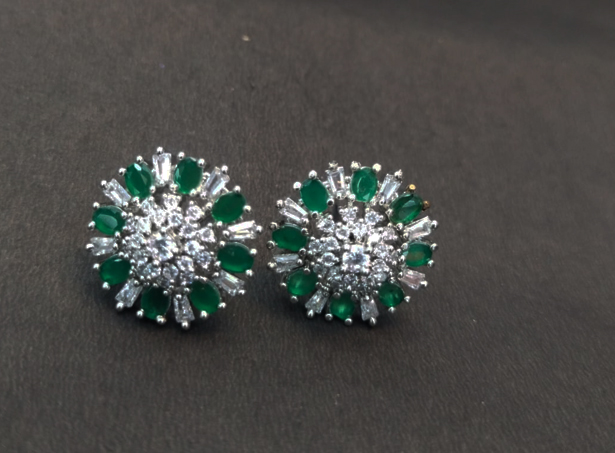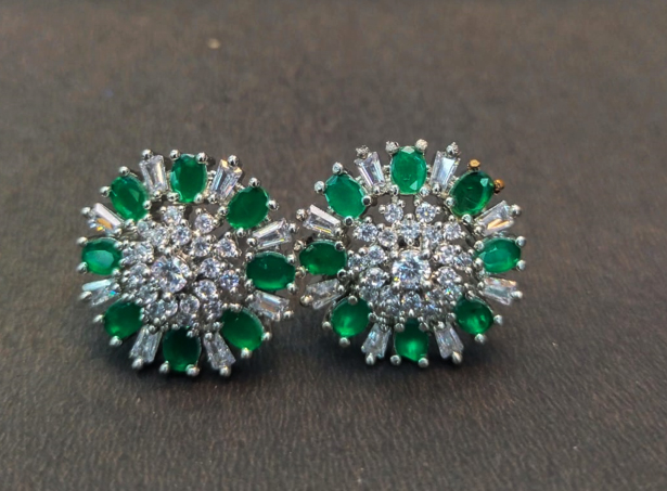 The striking combination of green and silver creates a luxurious and eye-catching look, perfect for pairing with traditional outfits like sarees or lehengas, as well as modern gowns. These earrings offer a bold and elegant statement to elevate any ensemble.