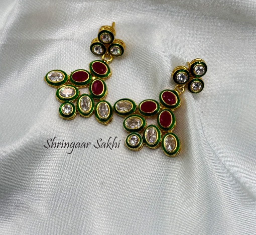 These beautiful earrings showcase a classic Kundan-style design, blending shimmering white stones with vibrant red and green accents. The intricate arrangement of stones, set in gold, gives these earrings a luxurious and festive feel. Their traditional charm, combined with the bold use of color, makes them an ideal accessory for celebratory occasions like weddings or festivals.