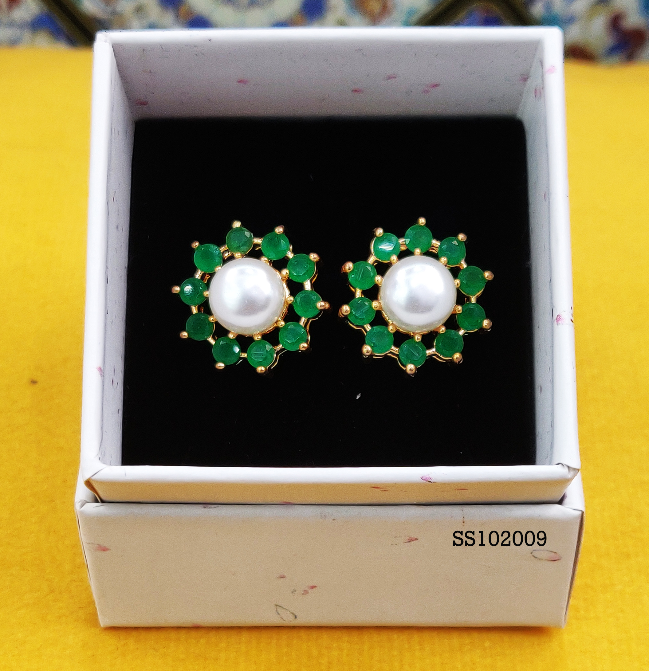 These elegant stud earrings exude classic charm with a vibrant twist. At the center lies a luminous faux pearl, surrounded by a halo of rich emerald-green stones set in a delicate gold-tone base. The symmetrical floral-inspired design adds a touch of grace and color, making these earrings a standout accessory that can easily elevate both traditional and contemporary outfits.