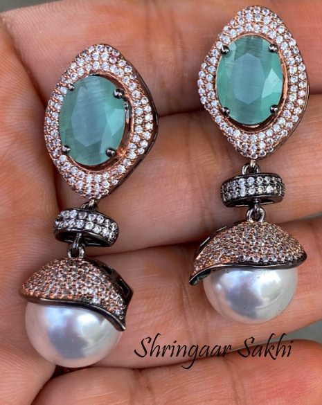 These elegant earrings feature a mint green gemstone framed with sparkling stones, leading to a pavé-set dome that holds a large white pearl. The combination of shimmer and soft tones gives them a luxurious and timeless appeal.