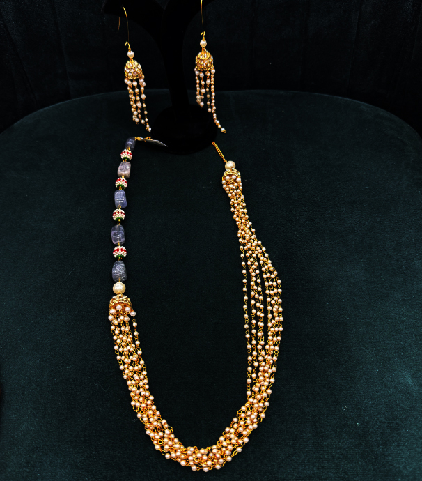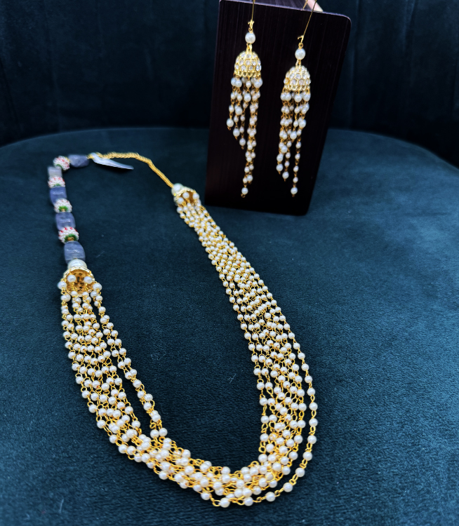 This elegant necklace features multiple strands of gold and pearl chains, paired with matching cascading pearl earrings. Perfect for traditional events or festive occasions, it adds a timeless and graceful touch to sarees, lehengas, or formal ethnic wear. The combination of pearls and gold lends a royal charm, making it an ideal accessory for weddings, festivals, or other special celebrations.