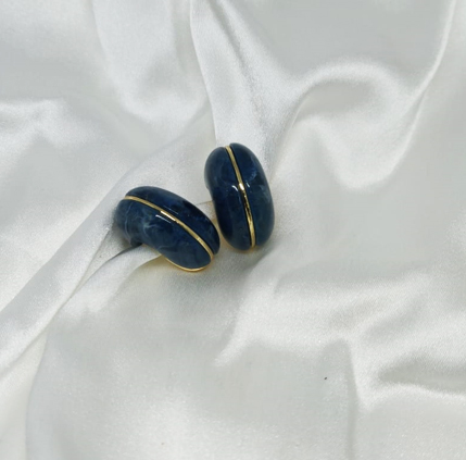 These chic half-hoop earrings feature a marbled navy-blue resin set in a sleek gold-plated frame. Their rounded, crescent shape offers a modern twist on the classic hoop, combining bold color with minimalist elegance. The swirled effect in the resin adds a touch of artistry, making each pair subtly unique. Lightweight yet statement-worthy, these earrings are perfect for elevating everyday outfits with a pop of color and contemporary flair.