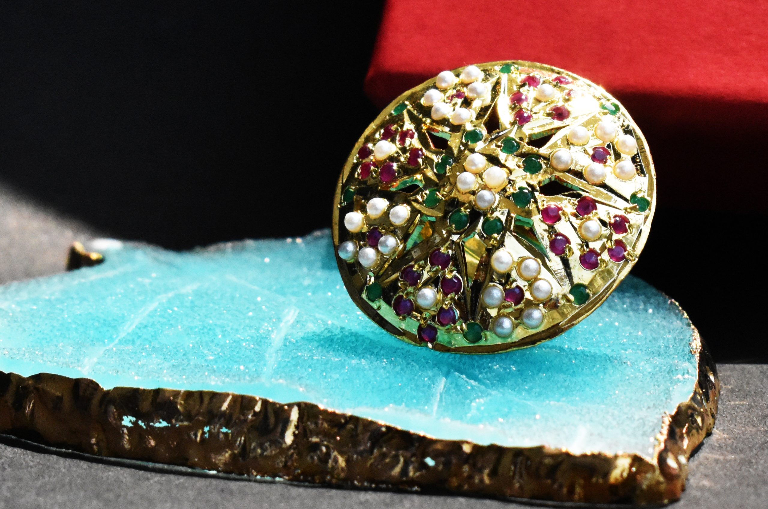 Traditional Ensemble: Elevate your bridal or festive look by pairing this ring with a Kanjeevaram saree or Anarkali suit. Complement it with matching kundan or pearl jewelry for a coordinated and luxurious finish.
