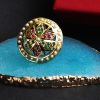 This majestic round finger ring from Shringaar Sakhi showcases a radiant blend of traditional elegance and intricate craftsmanship. The gold-tone finish forms the base for a detailed starburst pattern, embellished with clusters of ruby red and emerald green stones, accented by luminous white pearls. A striking statement piece, this ring adds regal charm to your jewelry collection and reflects timeless ethnic beauty.