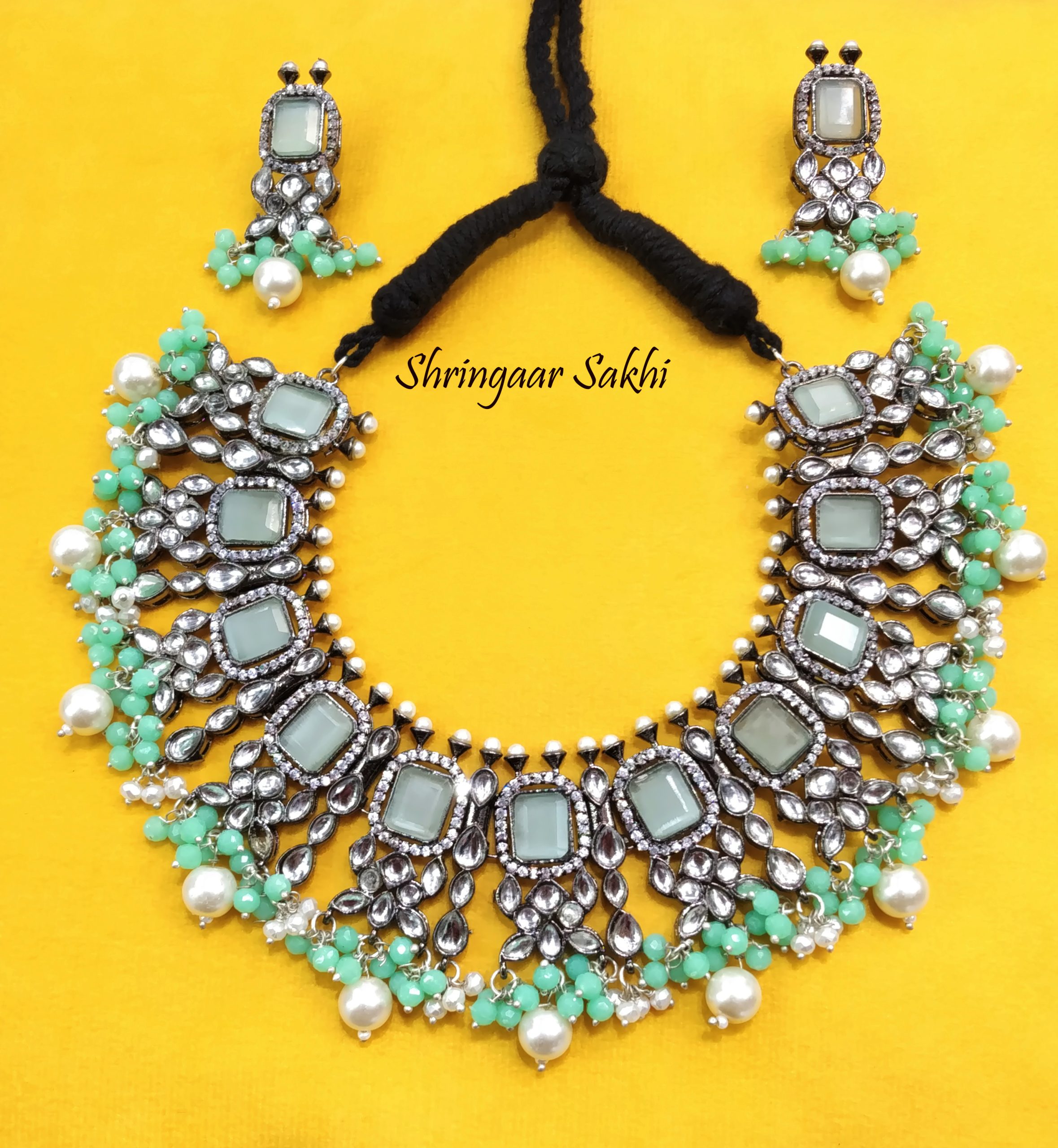 This regal necklace set from Shringaar Sakhi is a perfect fusion of heritage charm and modern elegance. The choker-style necklace features square-cut mint green stones bordered with American diamonds, surrounded by a detailed arrangement of mirror-finished kundan work. Accentuated with clusters of mint green beads and classic white pearls, the set comes with matching earrings that reflect the same intricate craftsmanship. The black dori (thread) adds a traditional touch while ensuring adjustable comfort for every neck size.