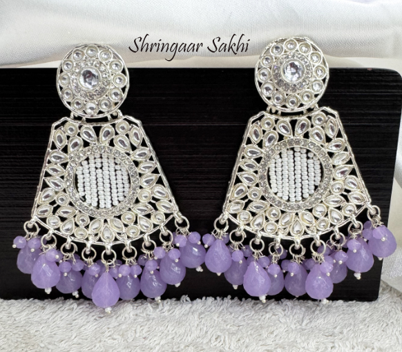 These stunning silver-toned earrings are designed in a triangular shape, intricately embellished with white beads and Kundan stones. The lower part of the earrings features beautiful lavender stone drops, which add a pop of soft color and a graceful charm. The circular detailing in the center, framed by delicate patterns, gives the earrings an elegant yet bold look, perfect for making a statement.