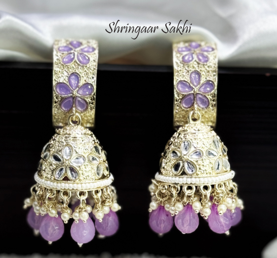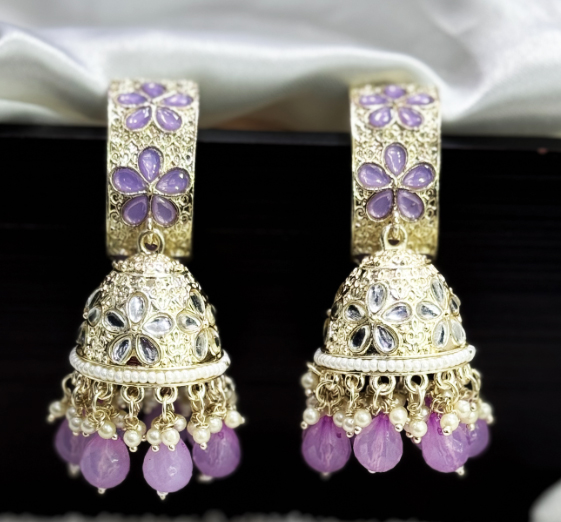 These beautiful jhumka earrings feature a delicate combination of lavender and gold, blending traditional jhumka style with modern floral detailing. The hoop portion is adorned with lavender enamel flowers set against a textured gold base, giving the piece a refreshing and feminine appeal. The lower jhumka is decorated with floral motifs in white stones, with small pearls hanging beneath, while lavender beads add a soft, graceful finish. The design strikes a balance between playful elegance and classic charm, making these earrings ideal for special occasions.
